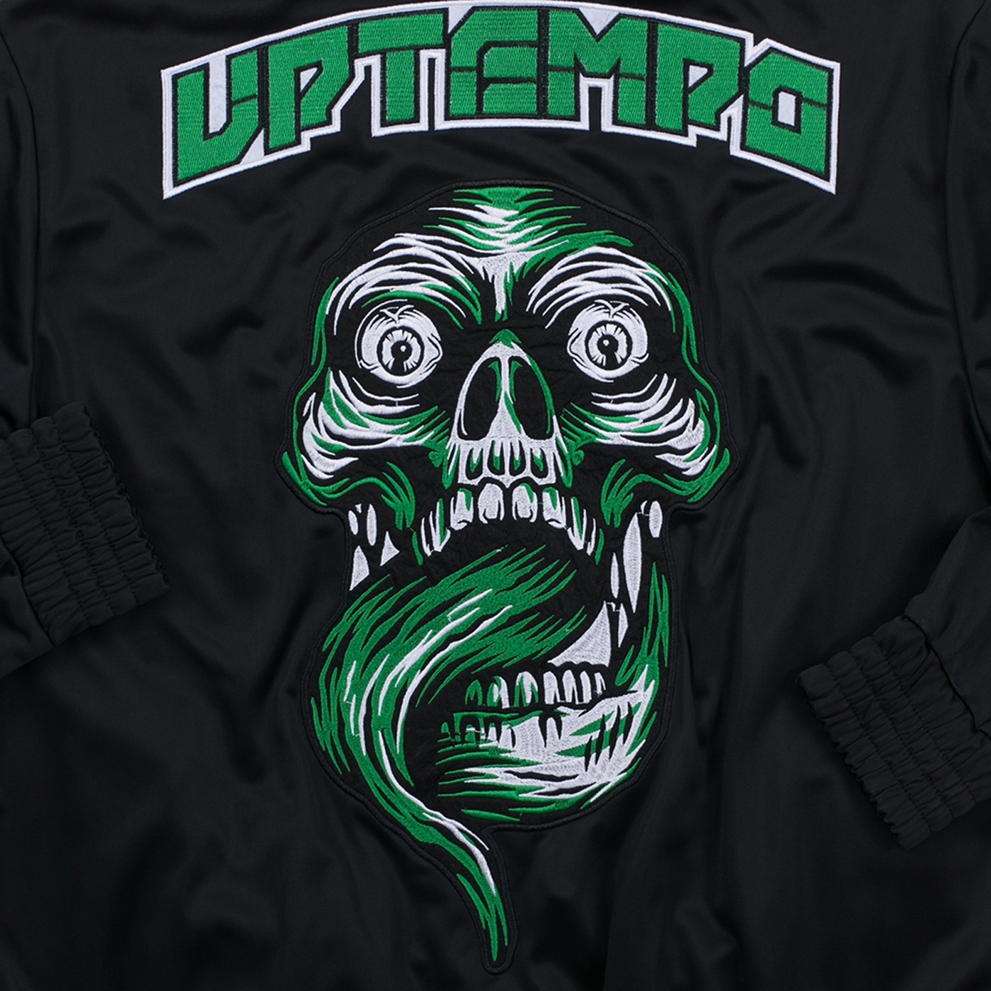 UPTEMPO Track jacket Mental. On the front there is a small skull on the right side. On the back of the jacket is a large skull with green elements.