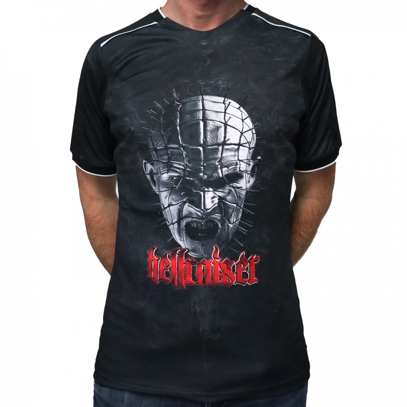 This shirt has a full color print of the famous ''Pinhead'' on the front and back.