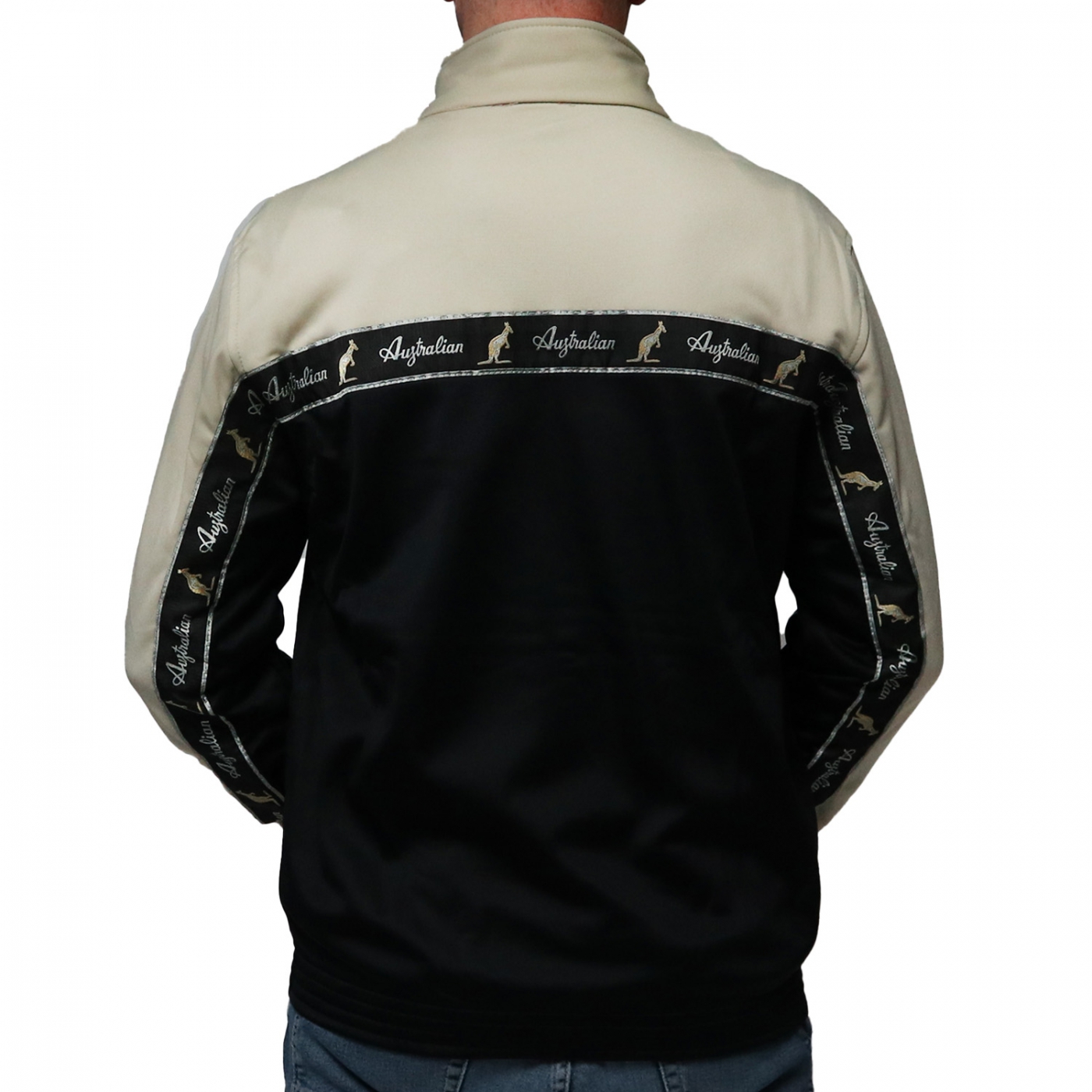 This jacket is of high quality and is black / sand colored with a black band / tape. It has the Australian logo on the front