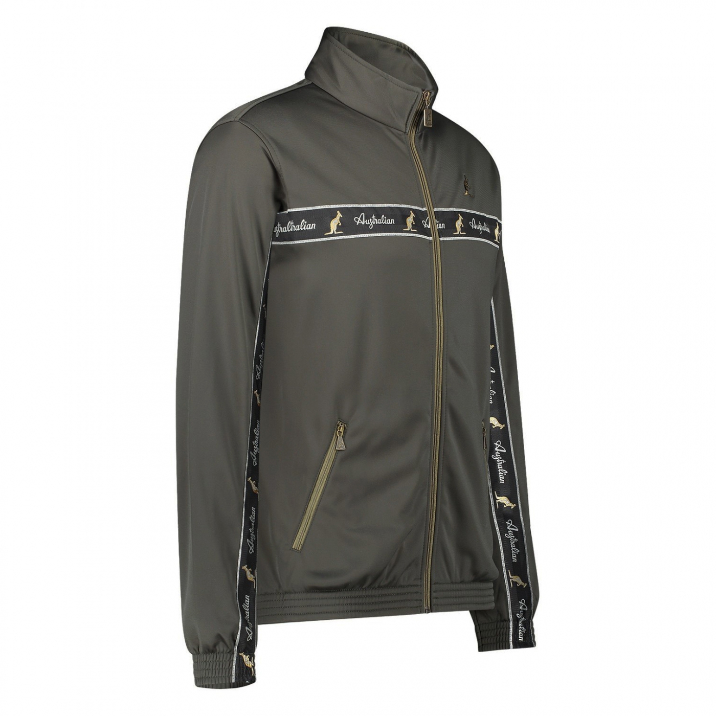 Australian jacket of high quality, the jacket is green with black tape, the jacket has two zipped pockets. On the left chest small Australian logo .