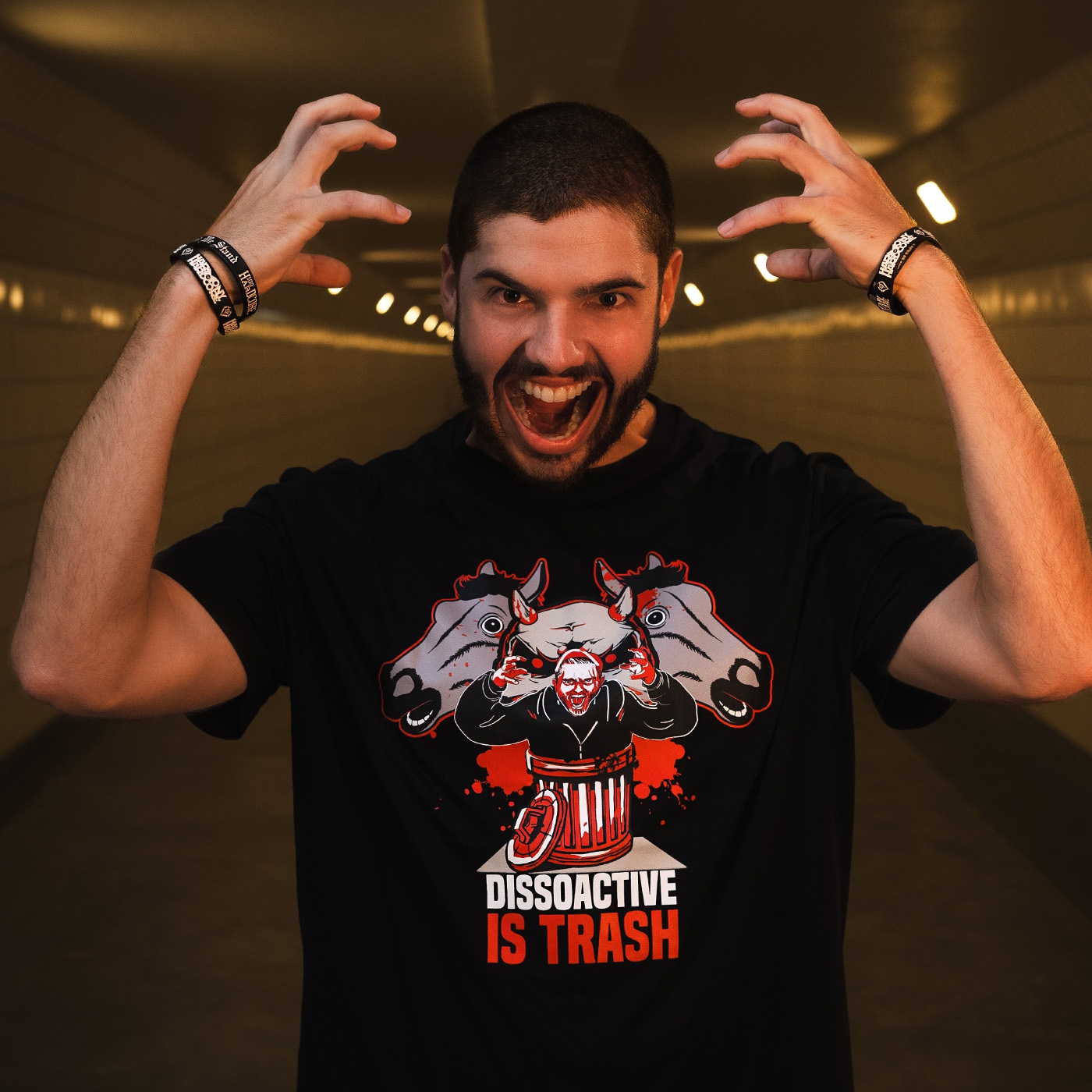 T-shirt showcases a bold and unique design with a big print on both the front and back. The artwork depicts Dissoactive, sitting inside a trash can alongside horses. This is a captivating composition inspired by the latest Dissoactive EP with a touch of irony.