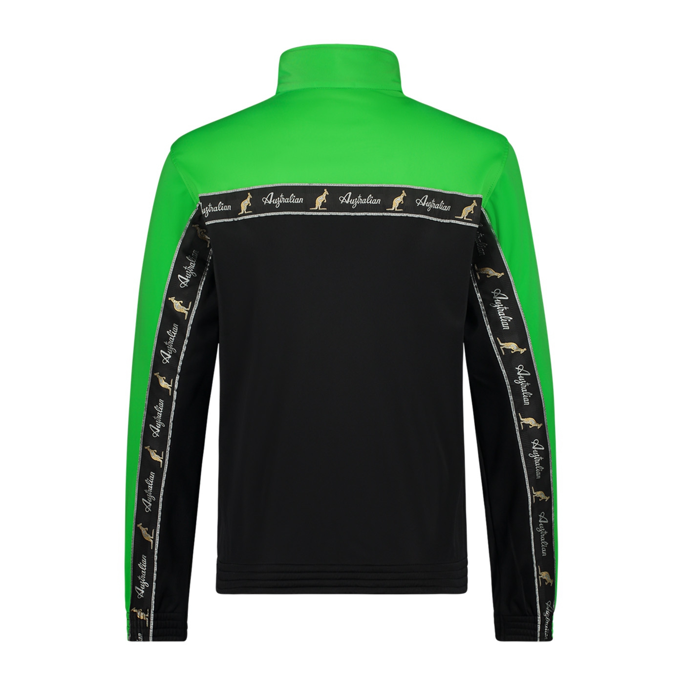 The Australian Duo Jacket features a vibrant color combination of bright green and black, perfectly complemented by black tape accents.
