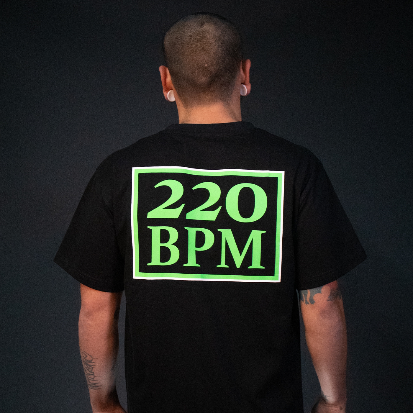 Introducing Rigeshop.com's 220 BPM Black T-shirt – a thicker, higher quality repress of a sold-out favorite. Perfectly paired with Air Max 90 BW Rotterdam, it features "Rotterdam" in white and green on the front and "220 BPM" on the back. Exclusively available, this tee is your bold statement in the hardcore legacy.