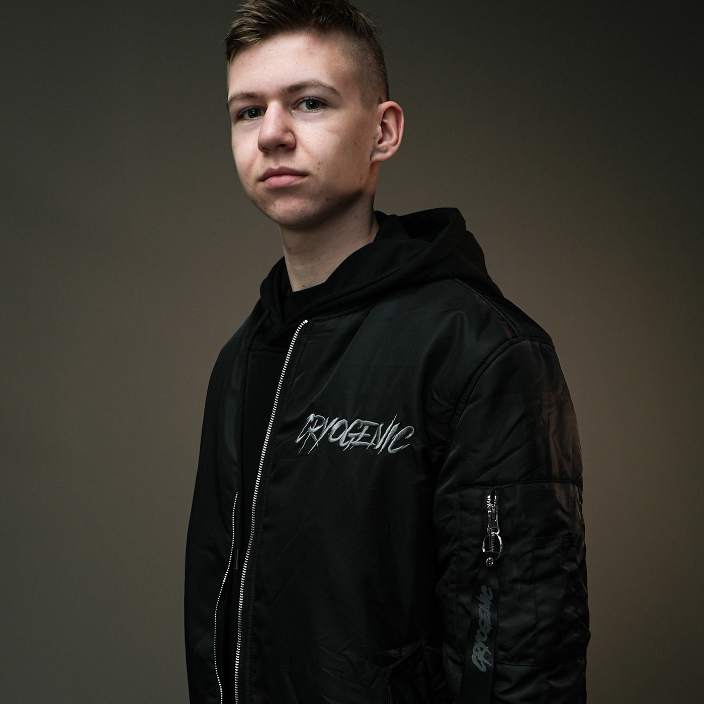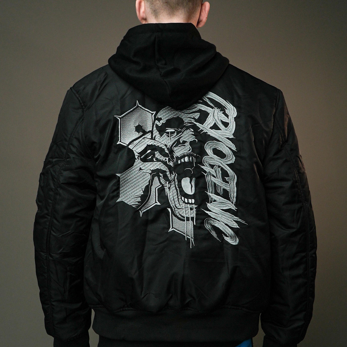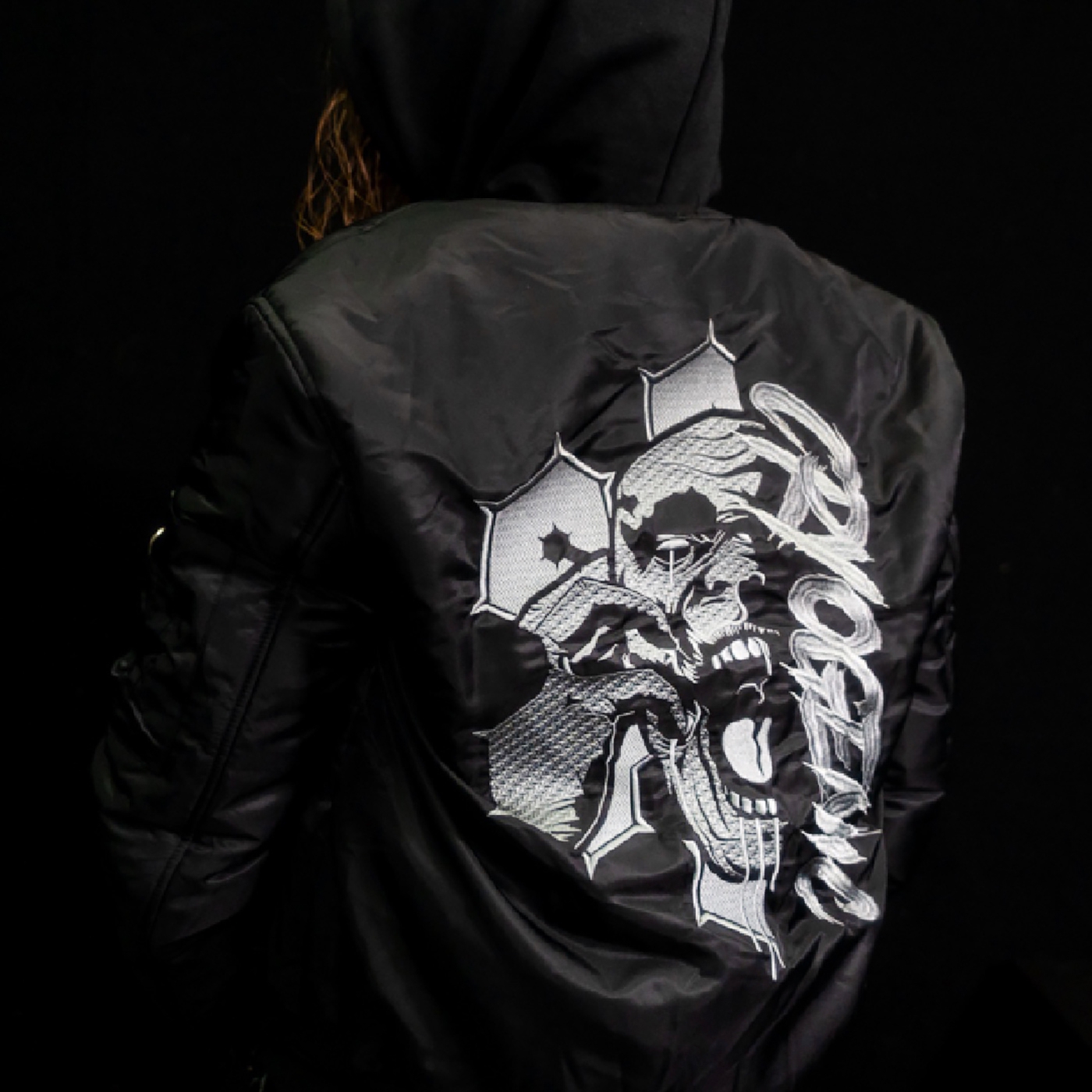 Black Cryogenic Bomber Jacket. This jacket features the Cryogenic logo stitched on the front. The sleeve also includes a keychain. The back of the jacket showcases Cryogenic logo.