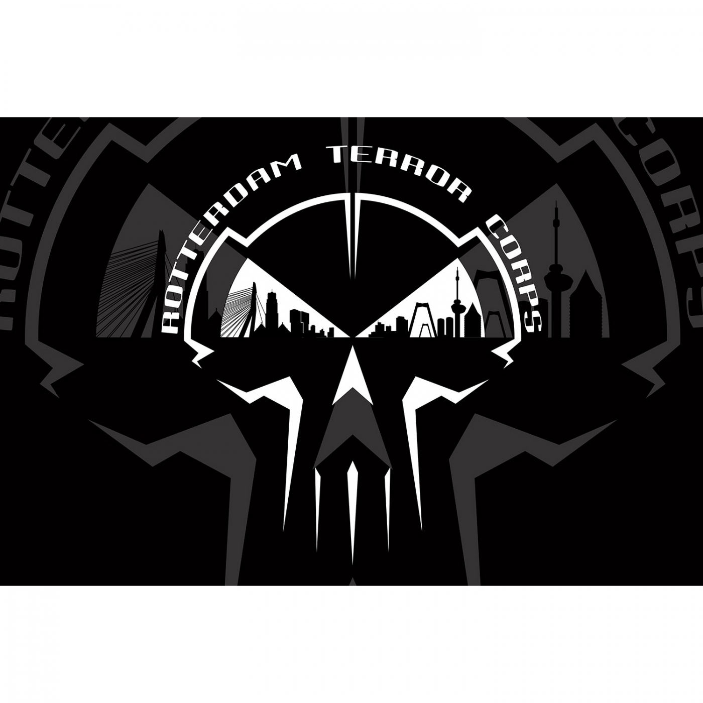 This flag is an ode to Rotterdam. The flag features the Rotterdam Terror Corps logo, with the Rotterdam skyline in the eyes.