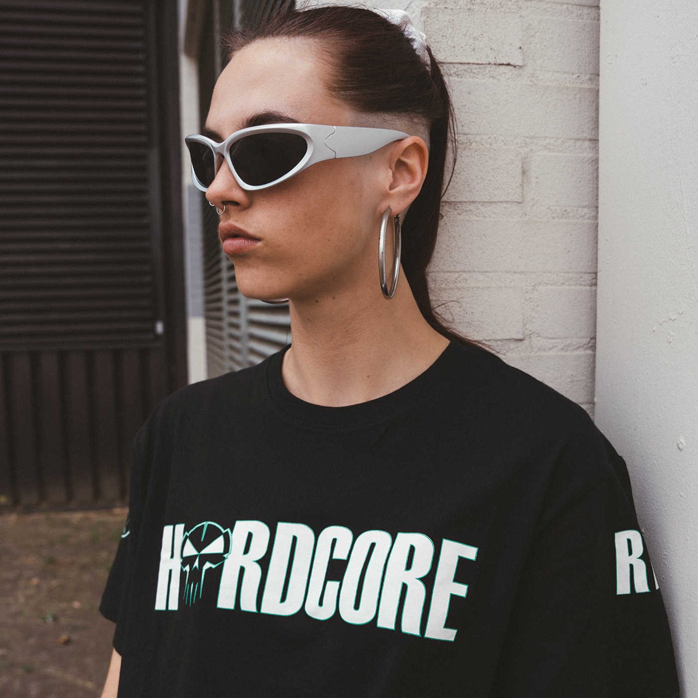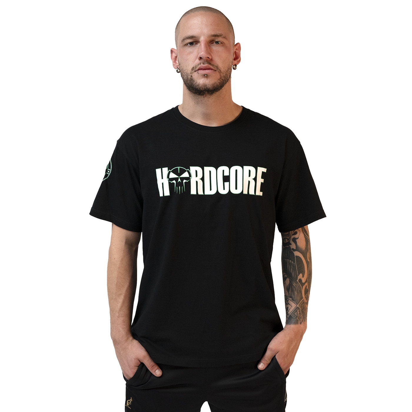 Black RTC T-Shirt, featuring bold green and white prints. The front showcases "Hardcore" lettering, the back displays a large Rotterdam Terror Corps logo. The sleeves are detailed with RTC inscriptions and a Hardcore - Gabber, Rotterdam Terror Corps stamp. This T-shirt offers a slightly oversized fit for a relaxed look. The model is wearing size S.