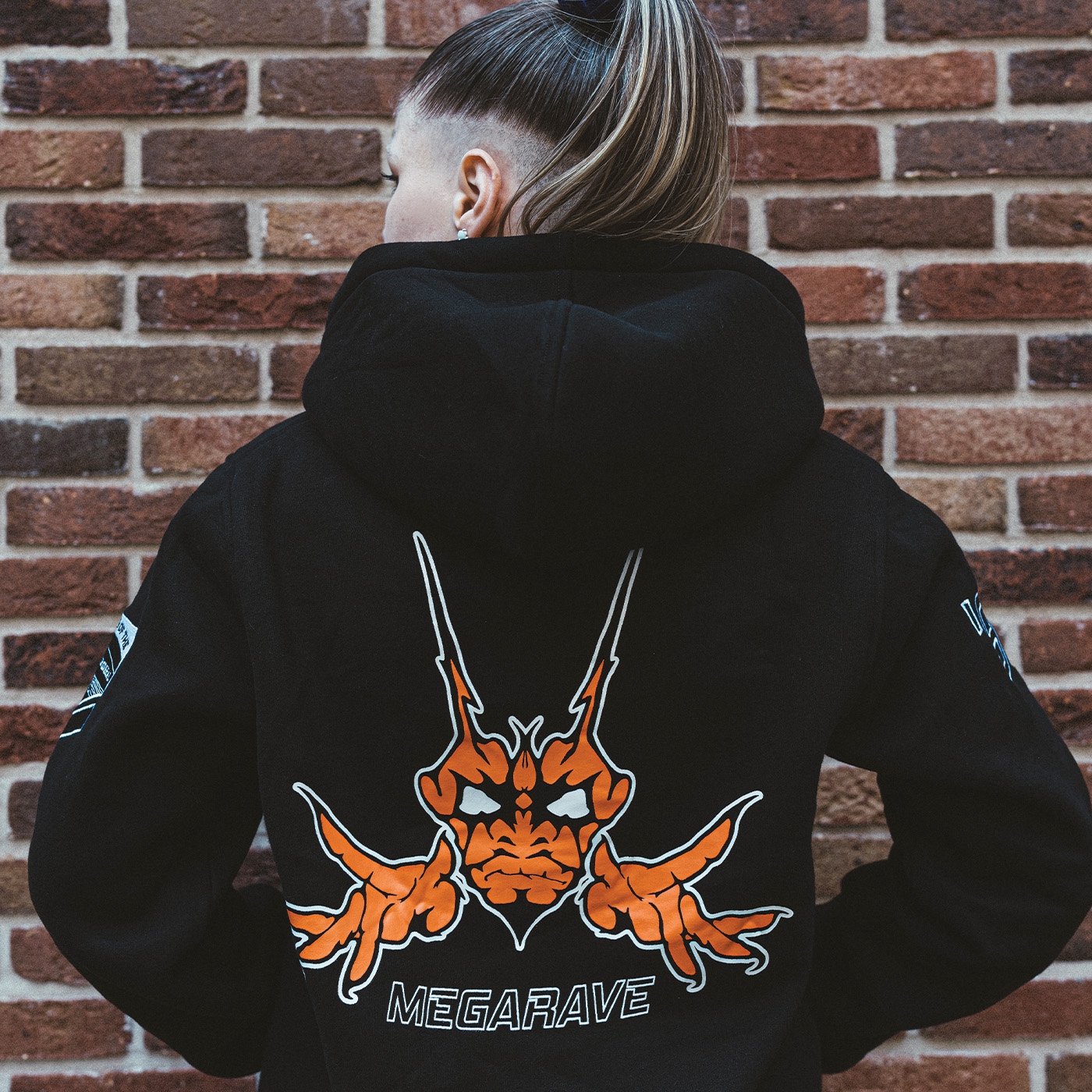 Soft black hoodie with a big Megarave logo on the back, '93' stitched on the right sleeve, and 'The Power of Energiehal' stitched patch on the left sleeve. Small Megarave on the left chest.