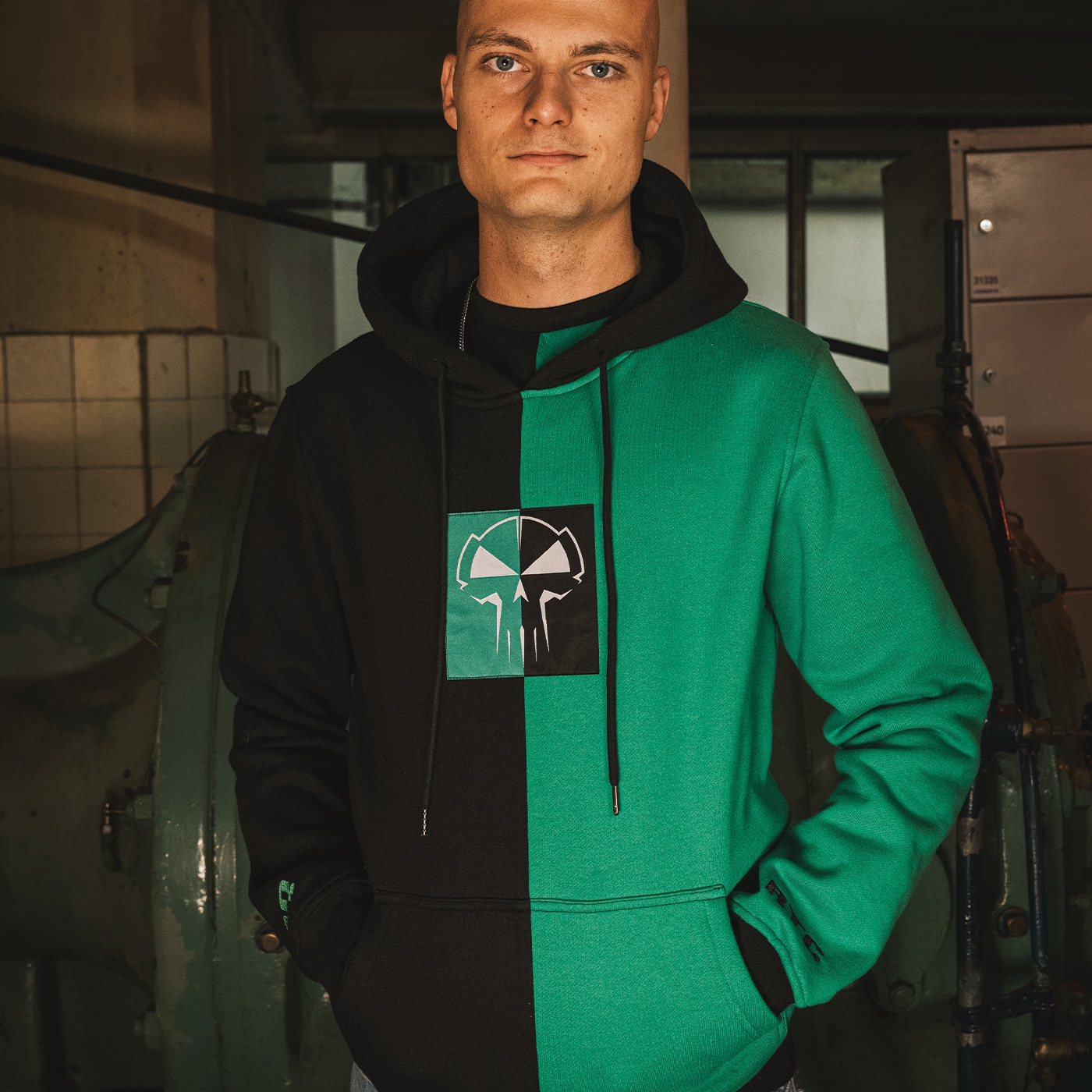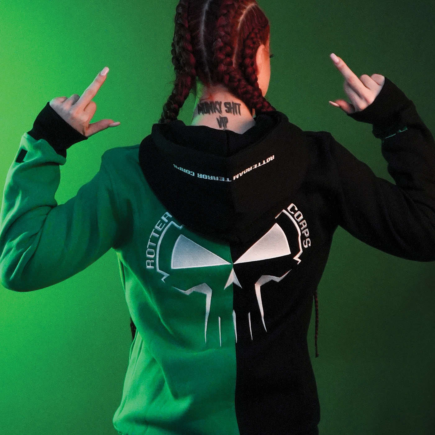 This high-quality Rotterdam Terror Corps hoodie is a green and black item with a logo on the chest, a large logo on the back, the year of RTC establishment on the sleeves, and the "Rotterdam Terror Corps" on the hood. Made to the highest standards.