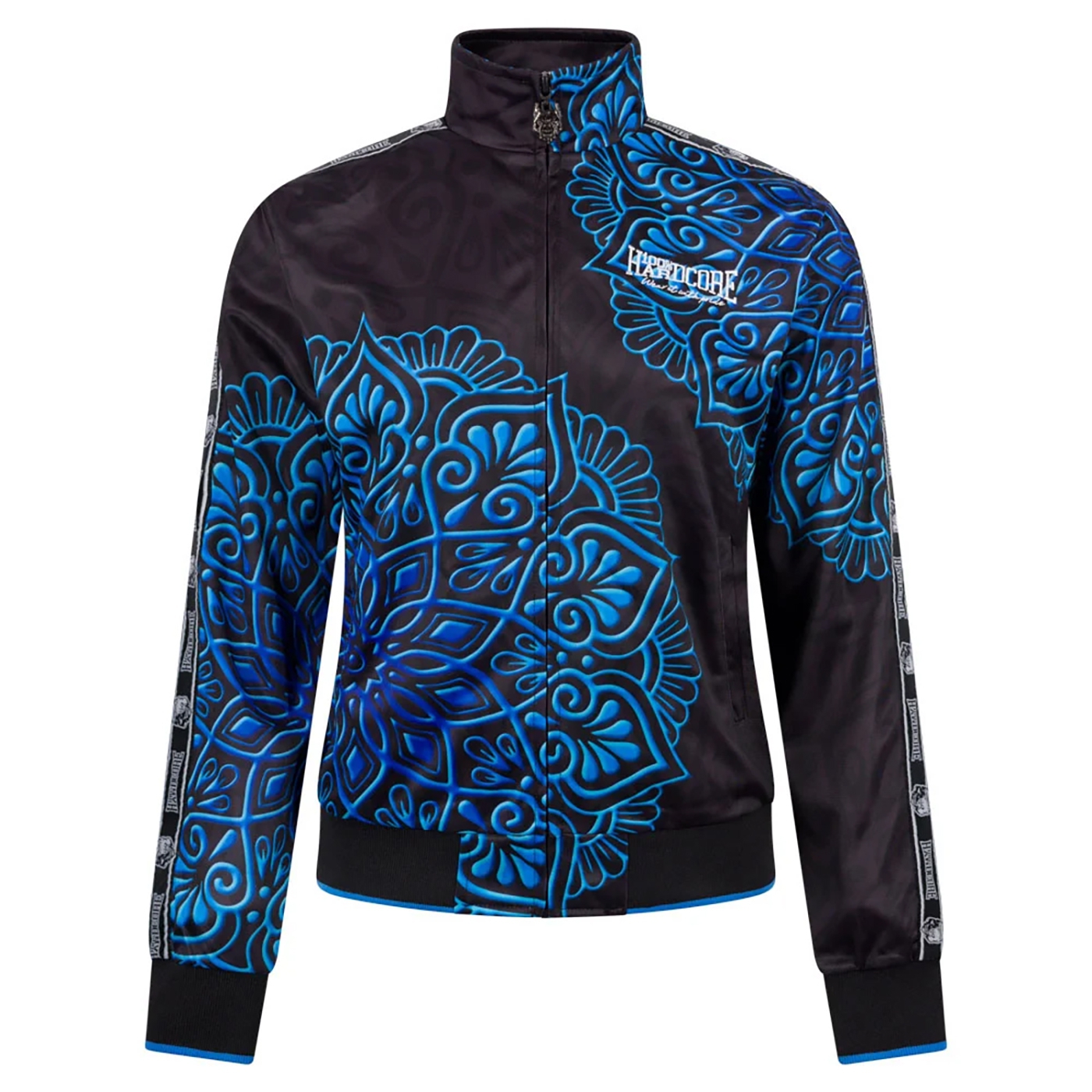The 100% Hardcore women's training jacket "'Mandala Blue''. This jacket features sublimation, striking artwork on the front and back, embroidered details, and tape on the sleeve.