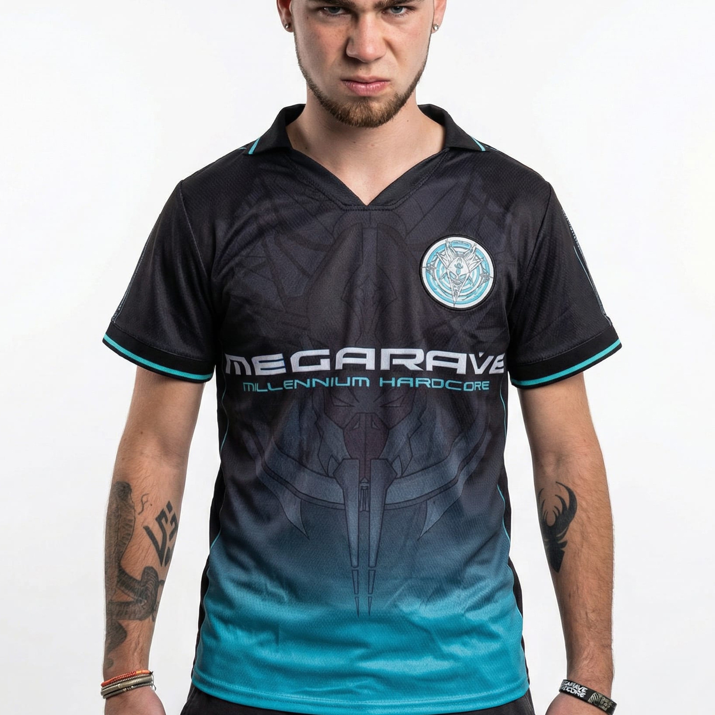 Soccer shirt crafted from breathable, lightweight fabric, featuring the official Megarave 2025 Millennium logo in a stunning aqua-blue all-over design with a matching front patch.