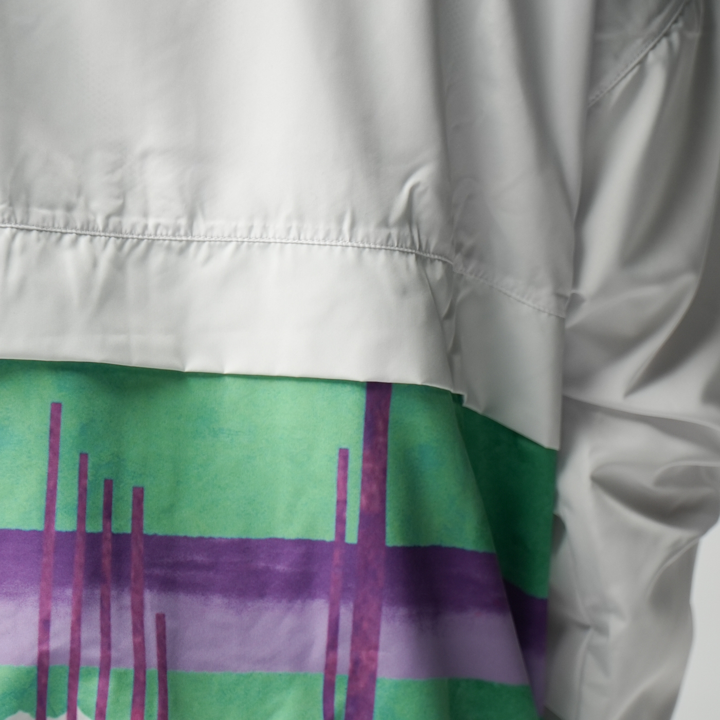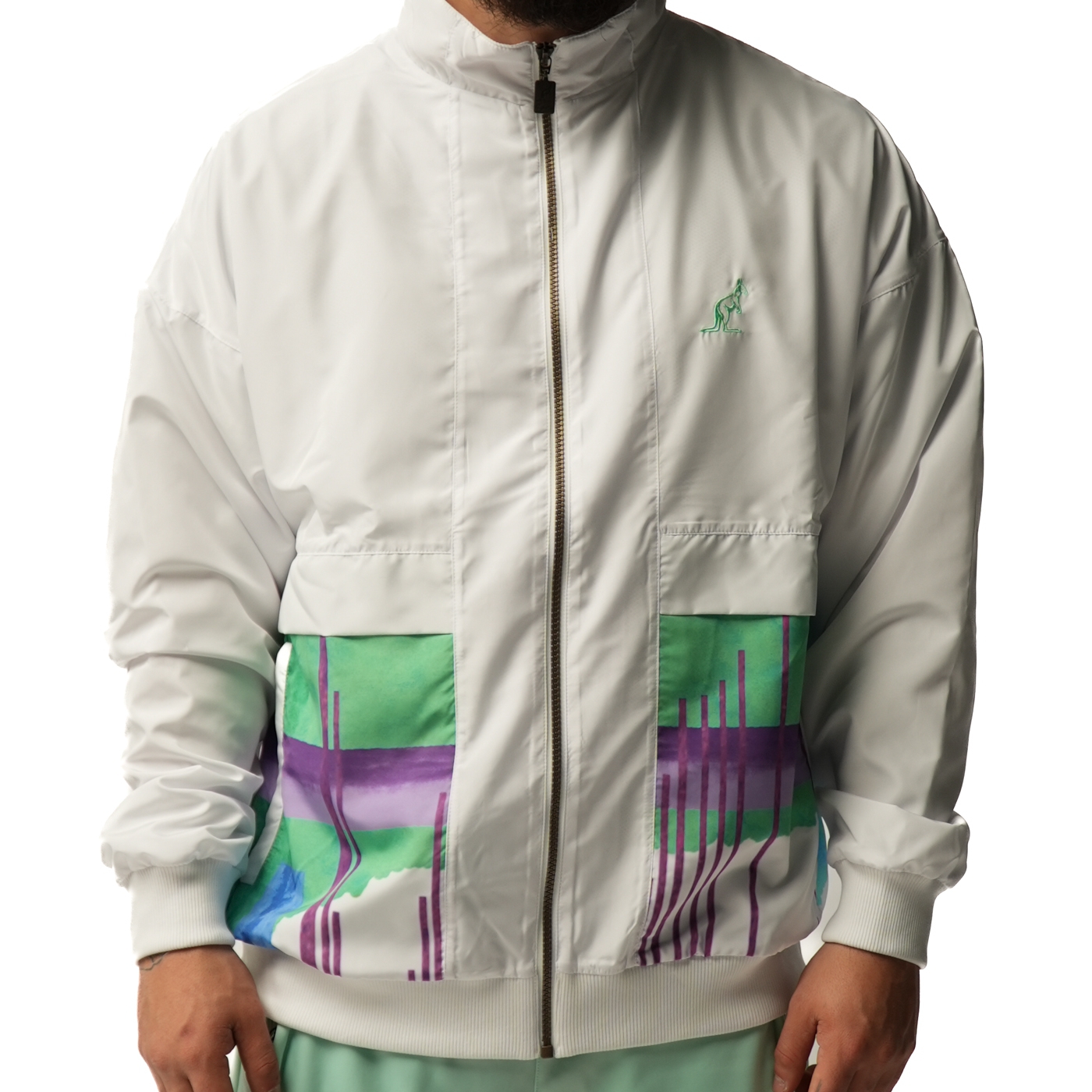 Retro vibes meet bold color. This clean white jacket features vibrant 90s-inspired archive prints, embroidered logo, and elastic cuffs. A limited-edition gem for real gabbers.
