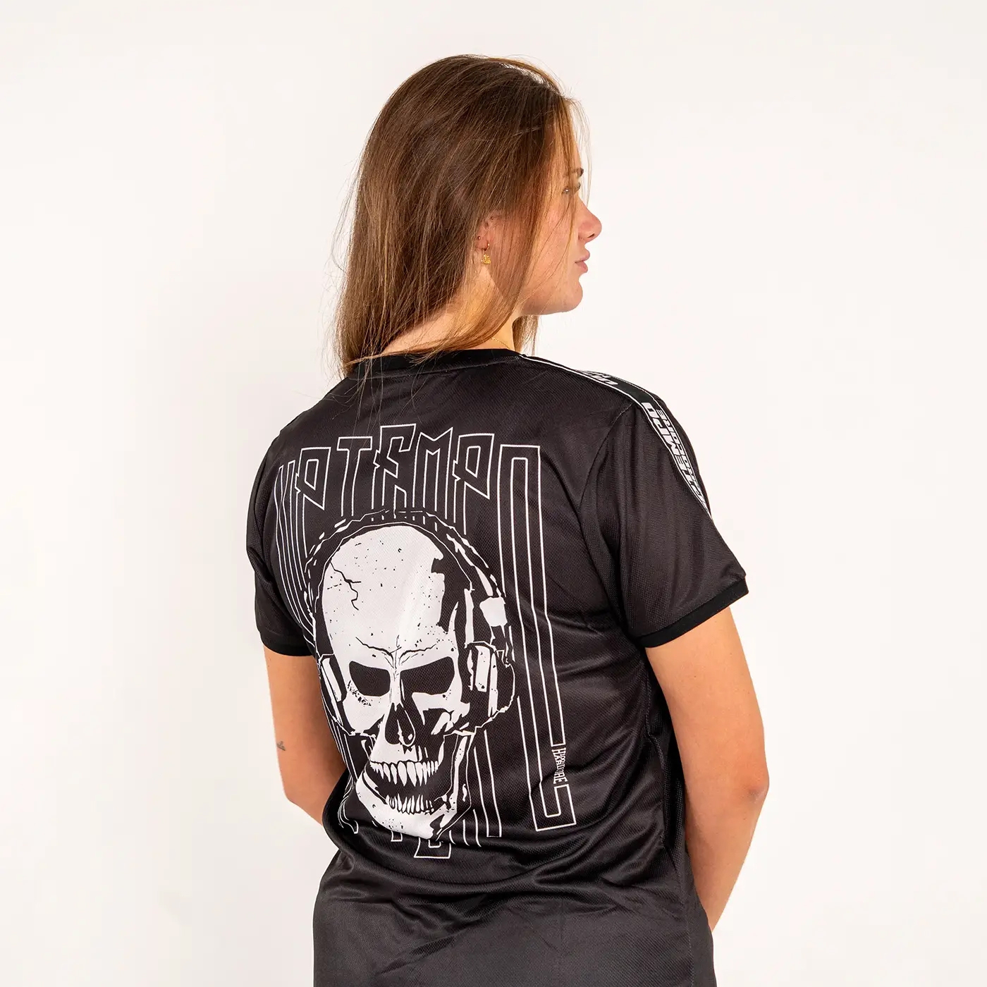 Bold rave vibes with this Uptempo soccer shirt. Features chest patch and embroidery logos, tape detailing on both sleeves, and full sublimation print. Perfect for your next hardcore session.