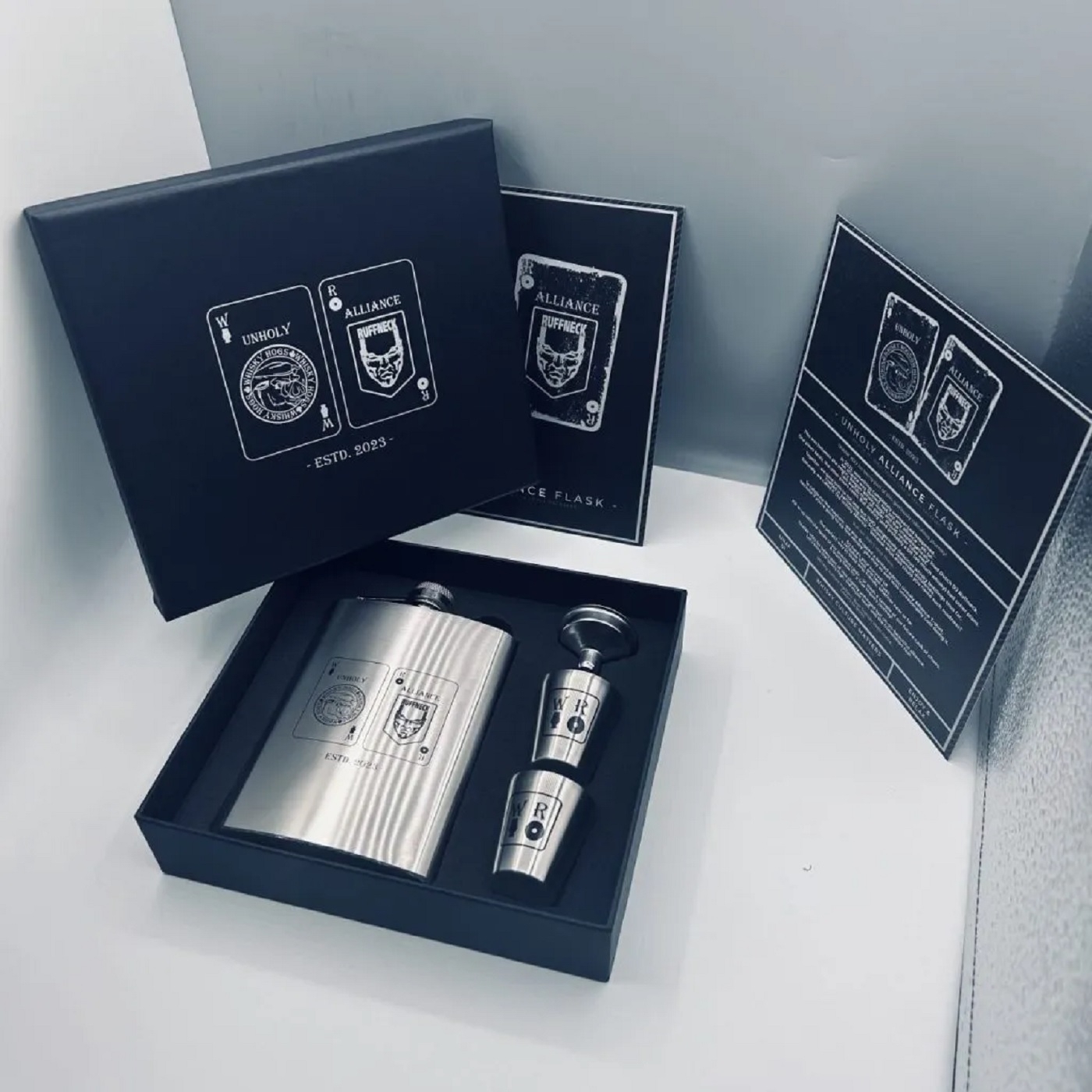 - Two stainless steel cups – both featuring Ruffneck’s whiskey emblem and the Whisky Hogs’ mark.