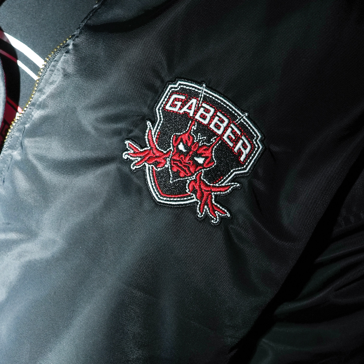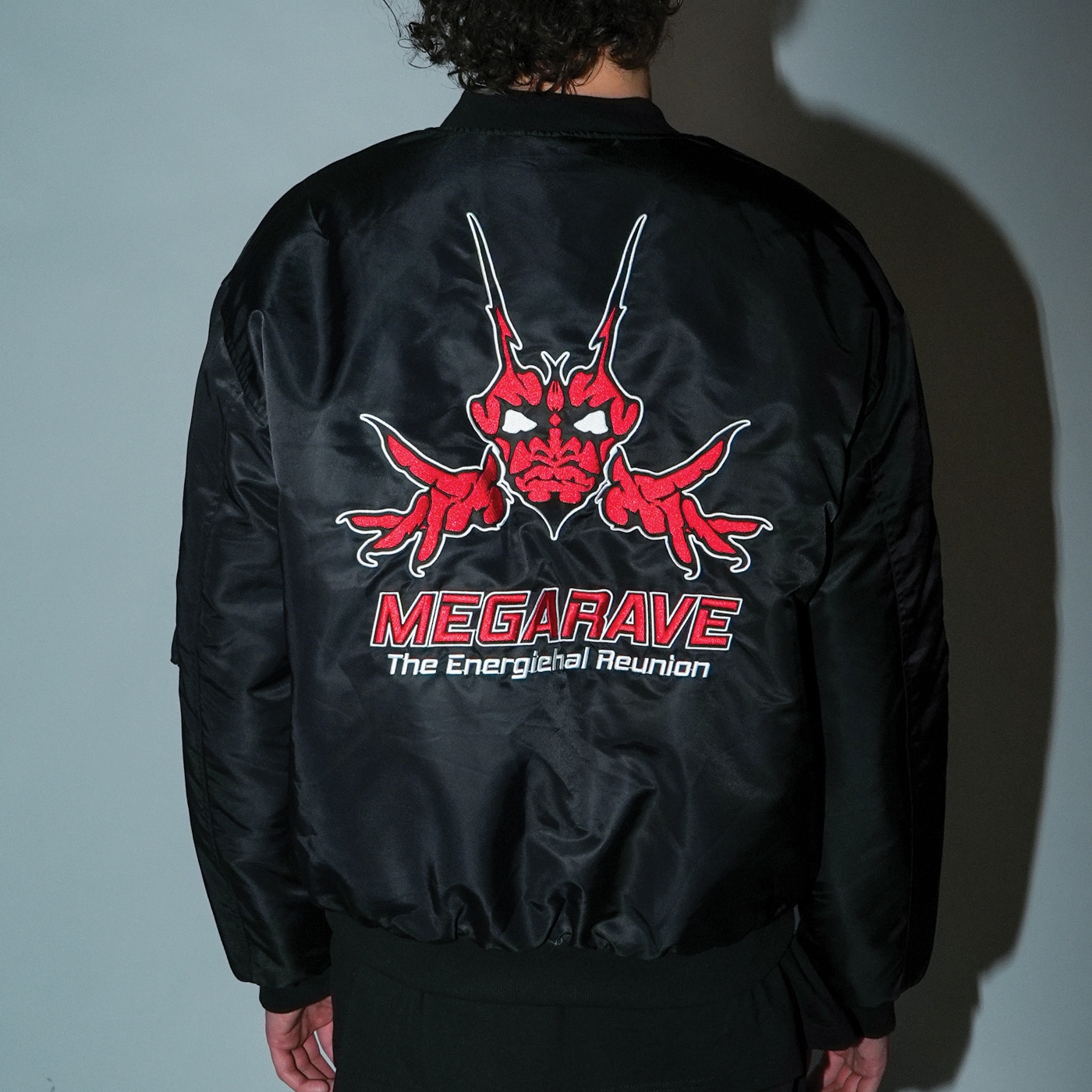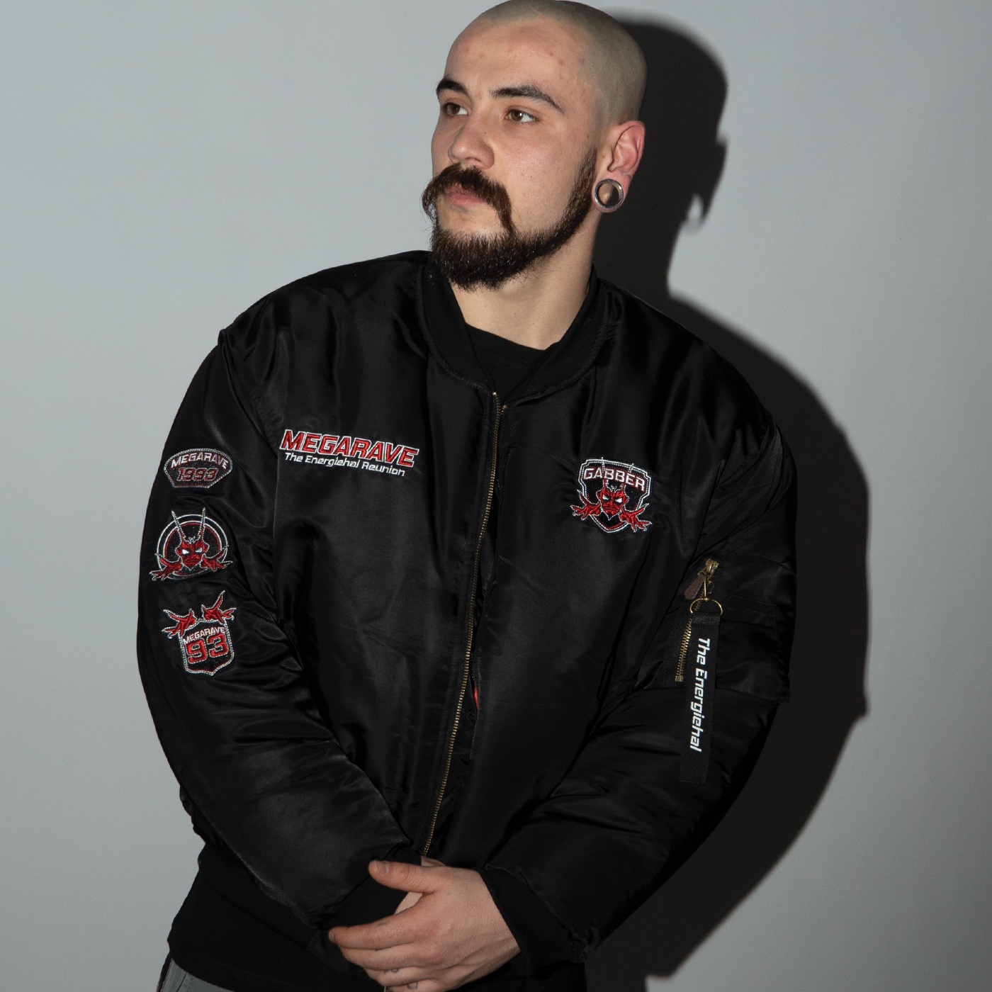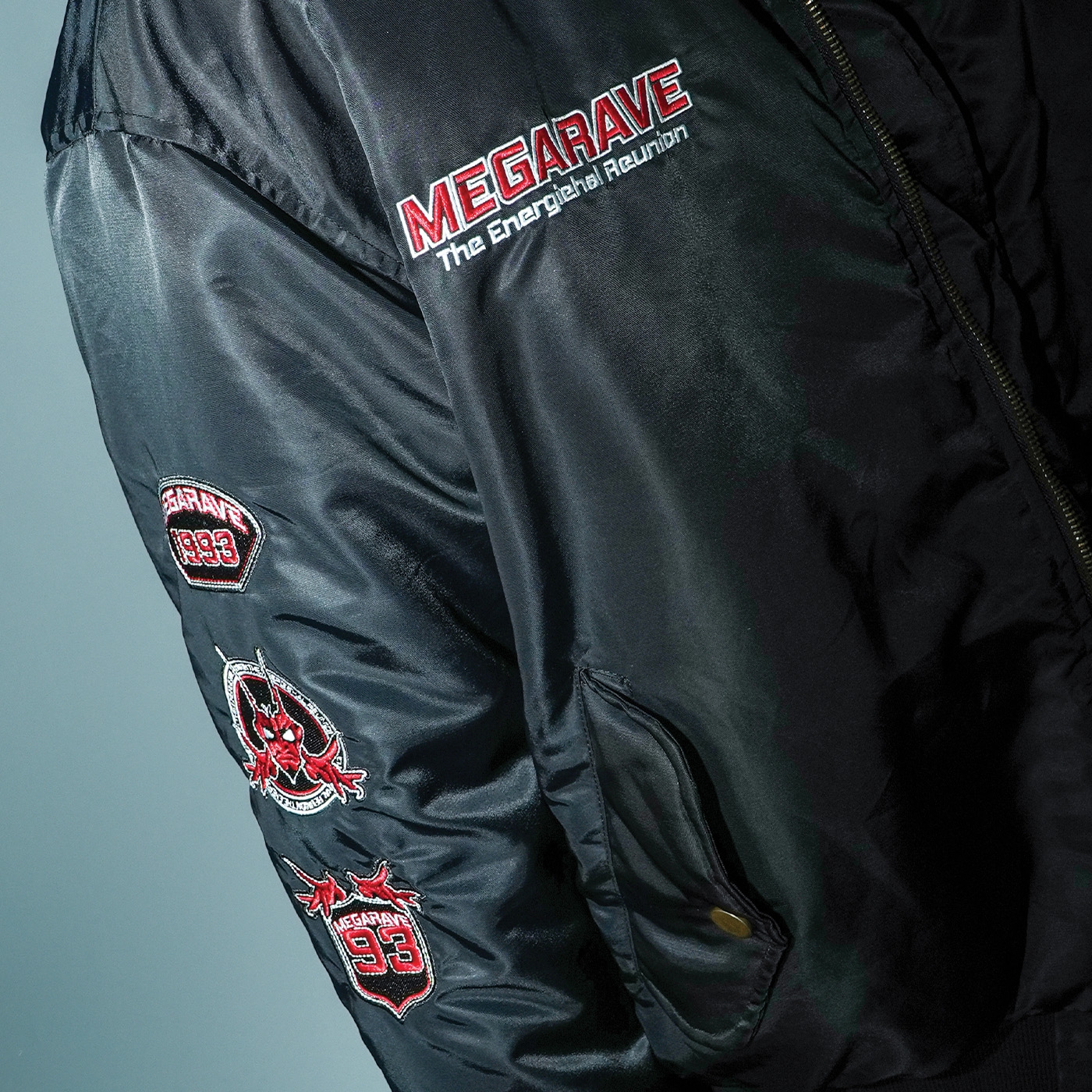 Megarave Bomber 'The Energiehal Reunion' This special edition features the iconic Megarave logo on the chest and a large text on the back: 'The Energiehal Reunion'. There are also three special badges on the right arm and the text: 'Megrave the Energiehal Reunion' is printed in the lining.