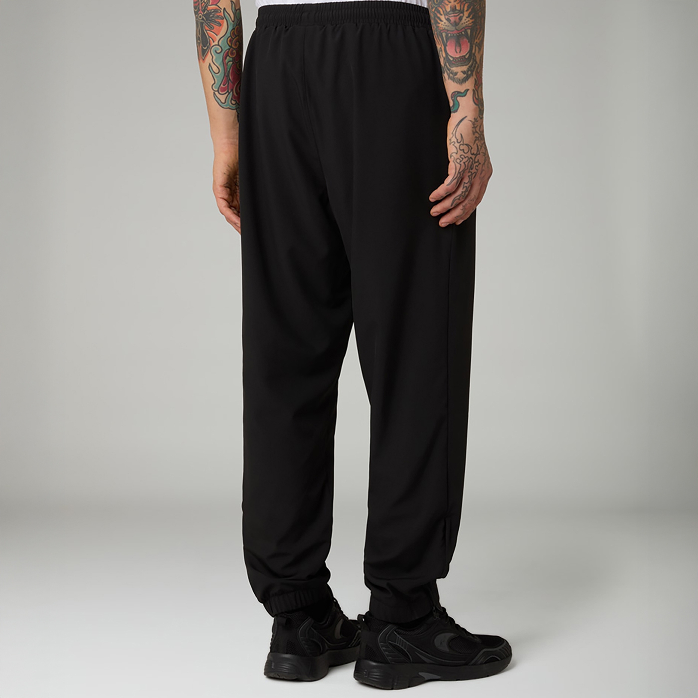Black Australian parachute pants with a striking purple and blue outlined vertical script logo and matching kangaroo emblem. Made from lightweight, smooth fabric for effortless comfort and everyday wear. Designed with an elastic waistband and adjustable drawstring for a secure fit, breathable mesh lining, slanted side pockets, and elastic cuffs for a clean, modern streetwear silhouette. A bold color contrast on a classic black base for a standout athletic look.