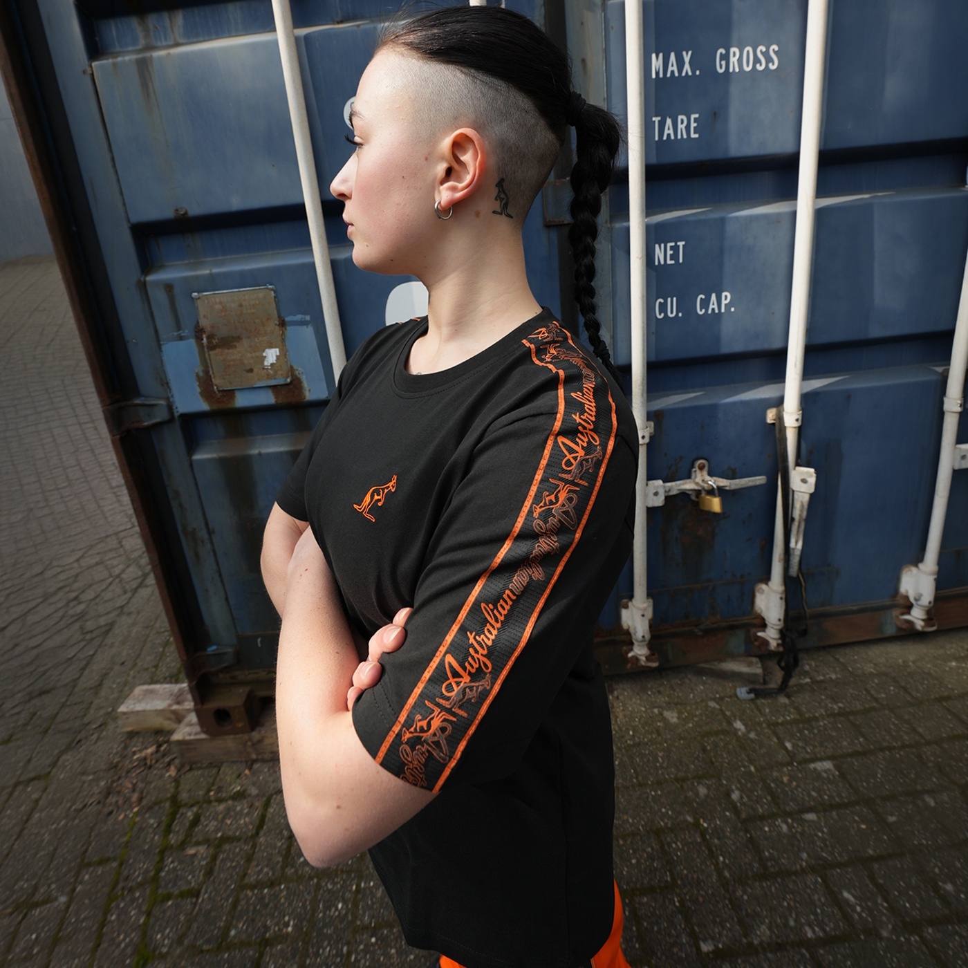This shirt is black with orange piping on the sleeves. The Australian logo is embroidered in orange on the chest.