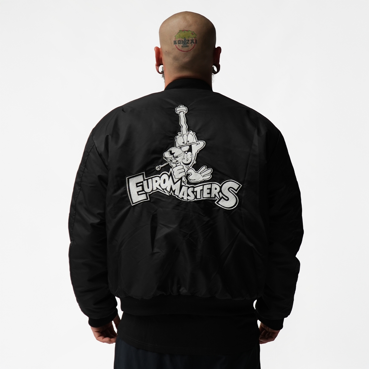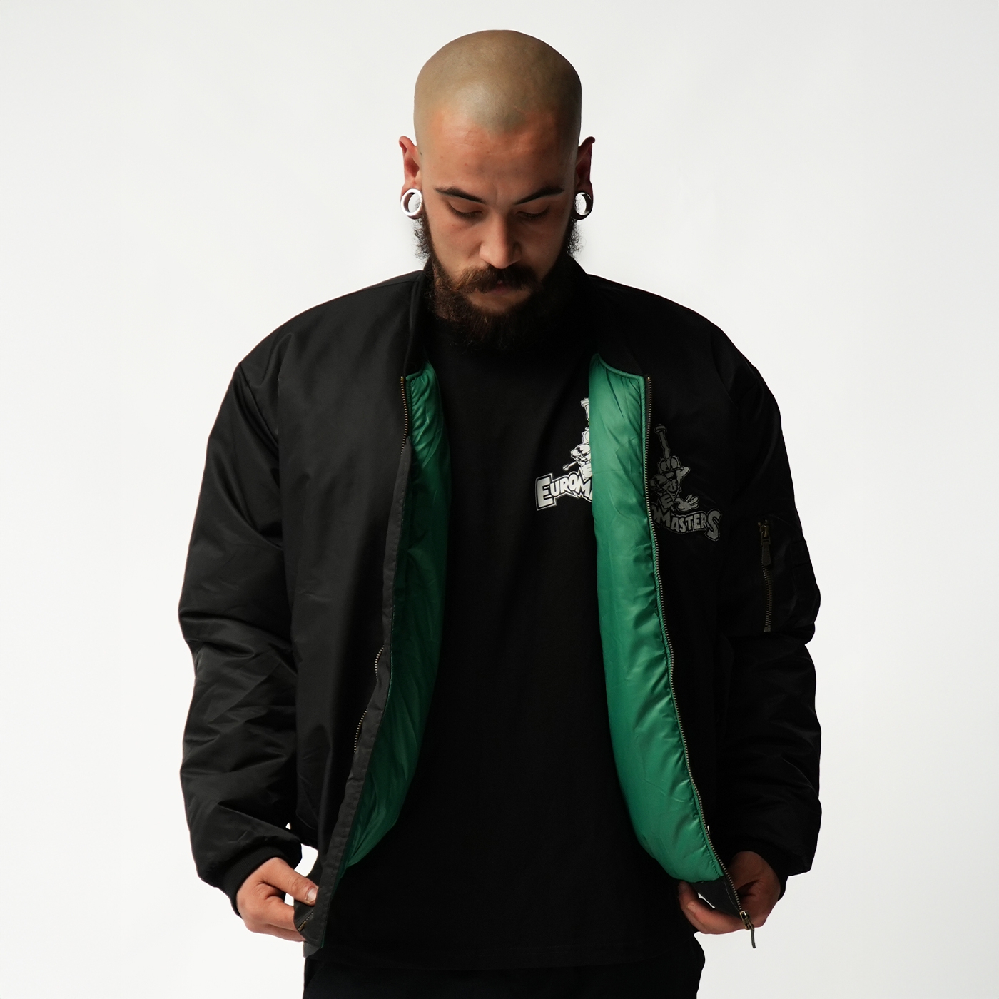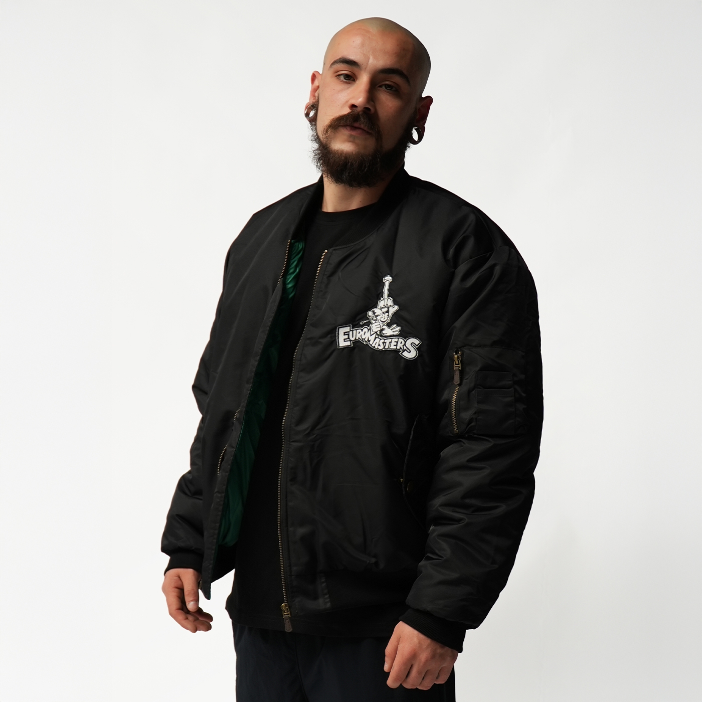 Every detail tells the story of authentic hardcore culture. This bomber carries the DNA of the scene. Black bomber jacket with embroidered Euromasters logo on the front, big logo on the back, and green lining with printed logo.