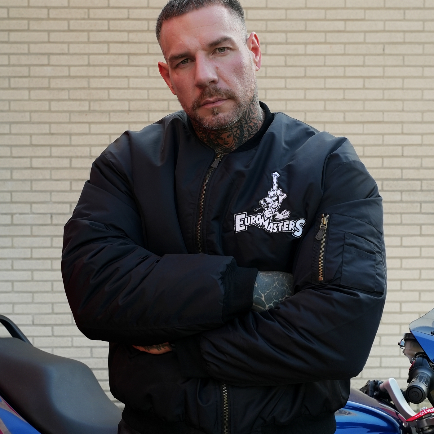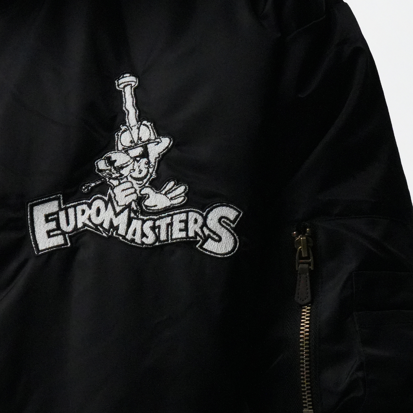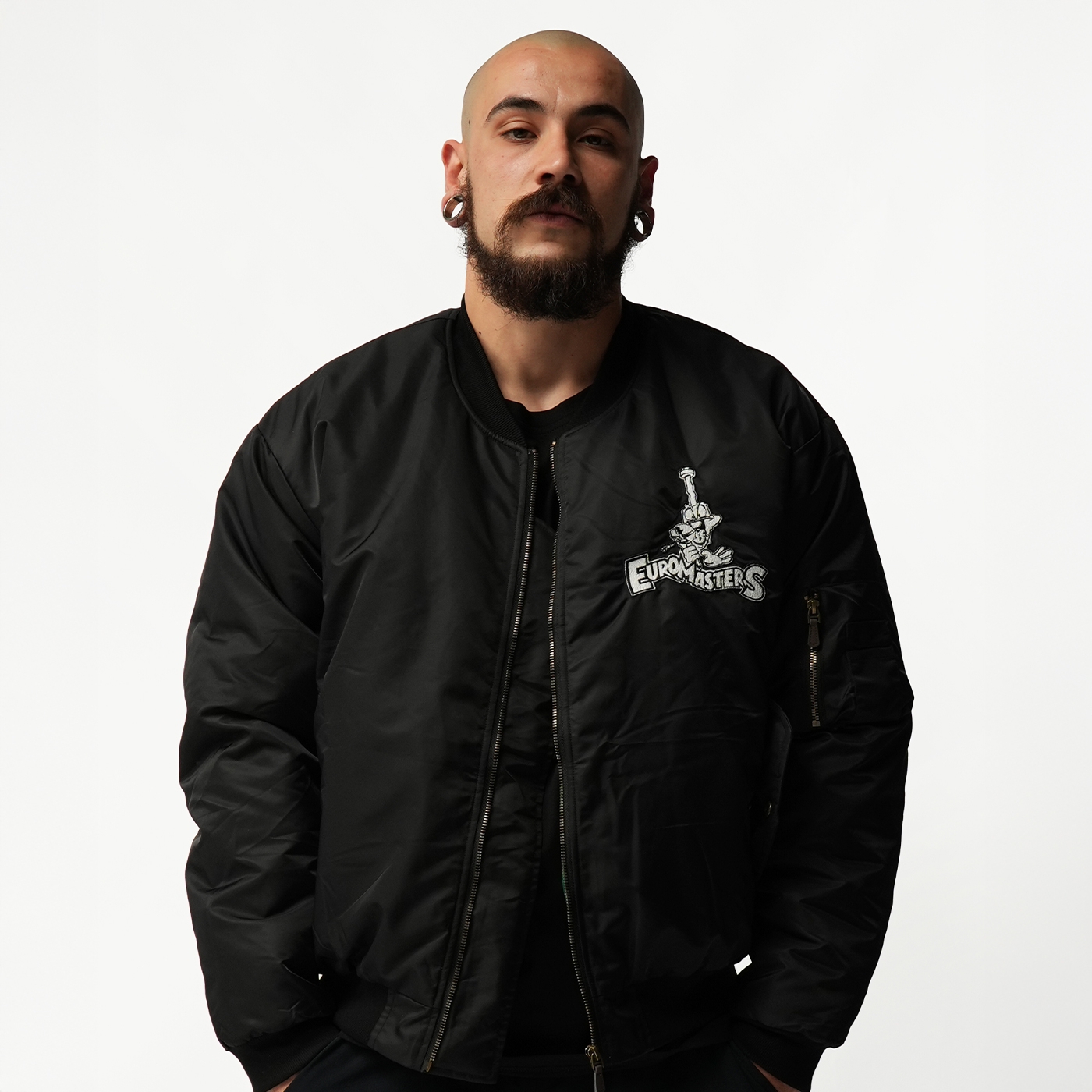 Every detail tells the story of authentic hardcore culture. This bomber carries the DNA of the scene. Black bomber jacket with embroidered Euromasters logo on the front, big logo on the back, and green lining with printed logo.