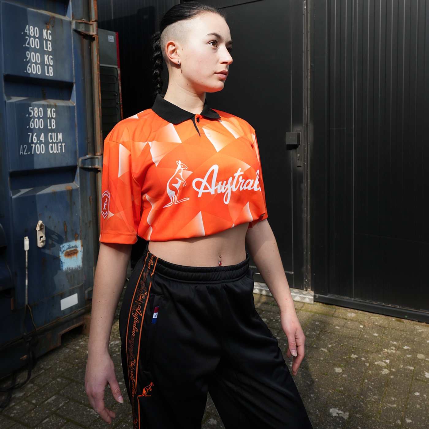 These black Australian trousers have black and orange piping on the side. The Australian logo is embroidered with orange stitching. The right trouser pocket has a flap with the Dutch flag.