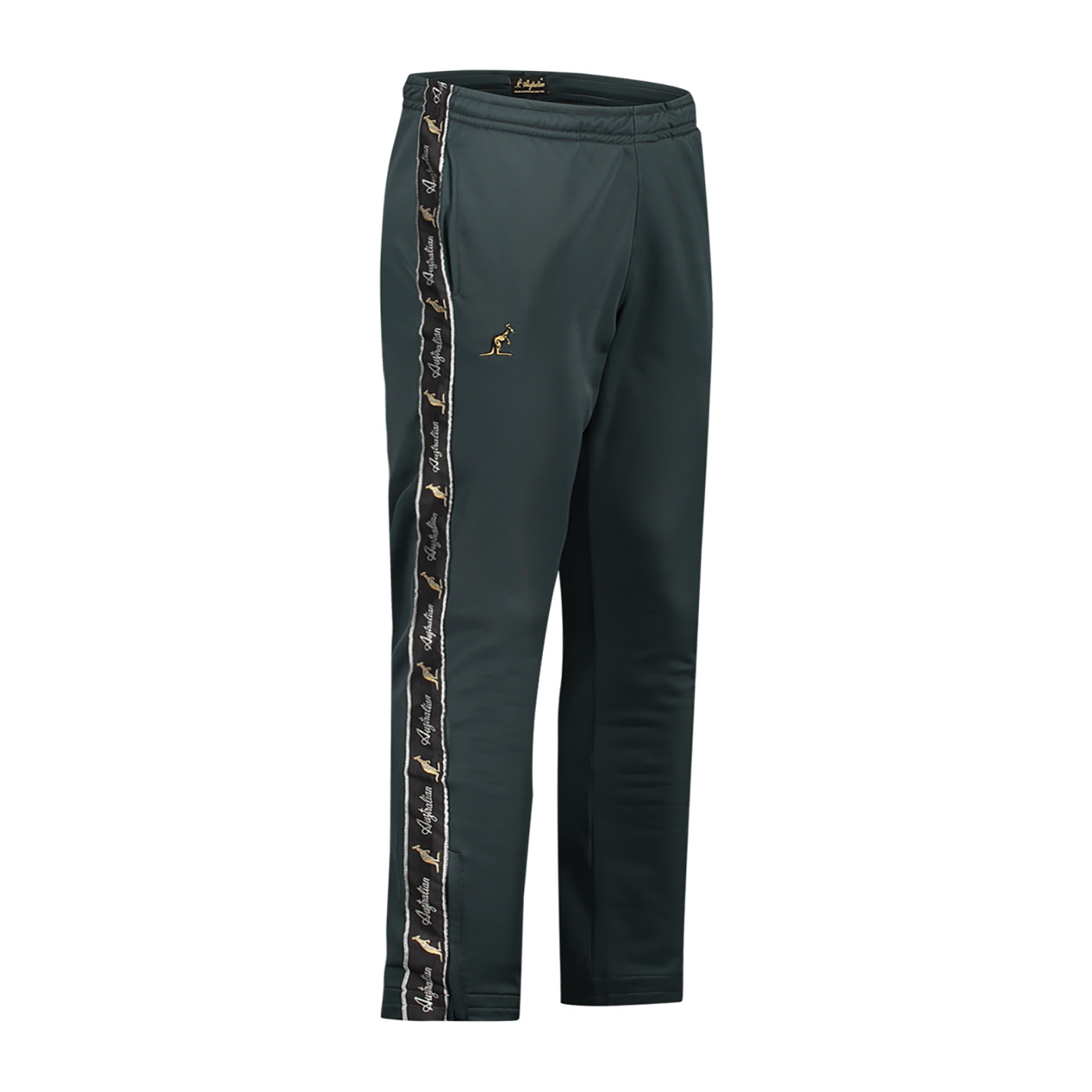 A cool black trim runs along both trouser legs, subtly decorated with gold kangaroos and silver letters, which gives the trousers an exclusive and powerful look. The gold embroidered Australian logo on the right thigh underlines the craftsmanship and authenticity of these trousers. The elastic waistband with lace-up closure ensures a perfect fit, while the zippers at the pockets and trouser legs provide a practical and luxurious finish