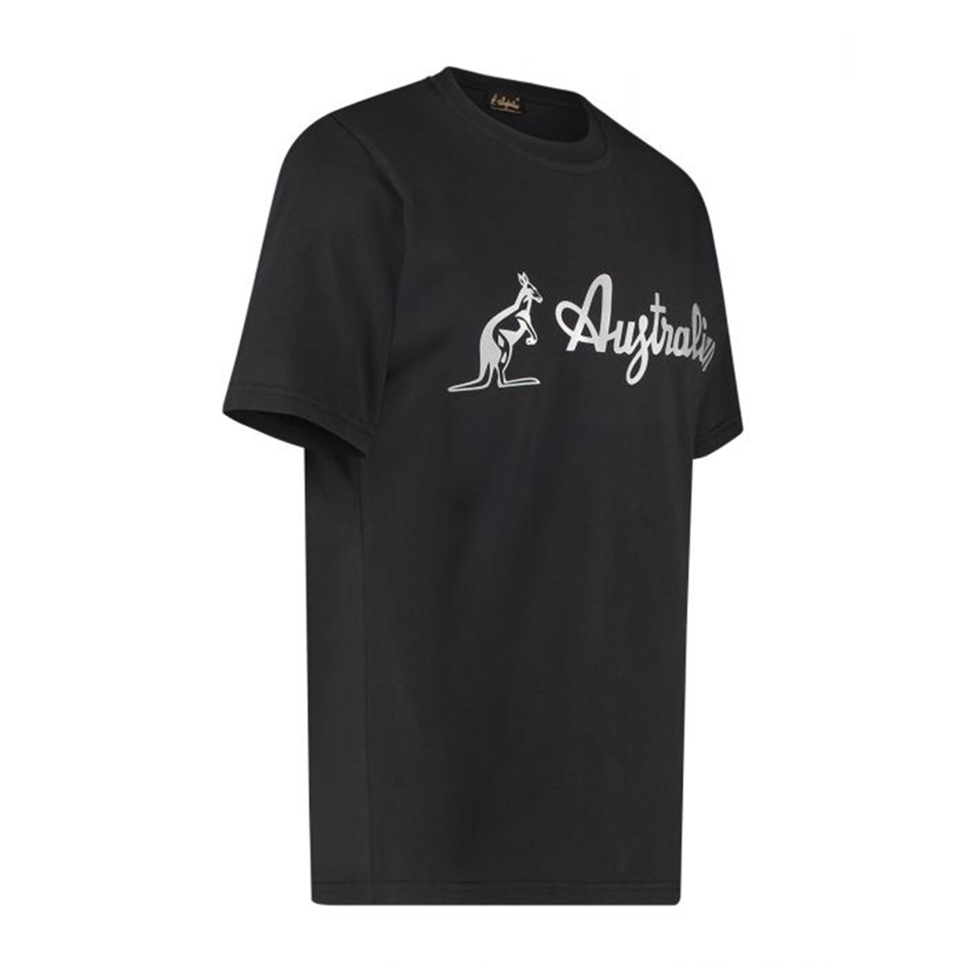 Black Australian t-shirt with a silver logo on the front. No print on the back. This shirt of 100% Cotton is of very high quality.