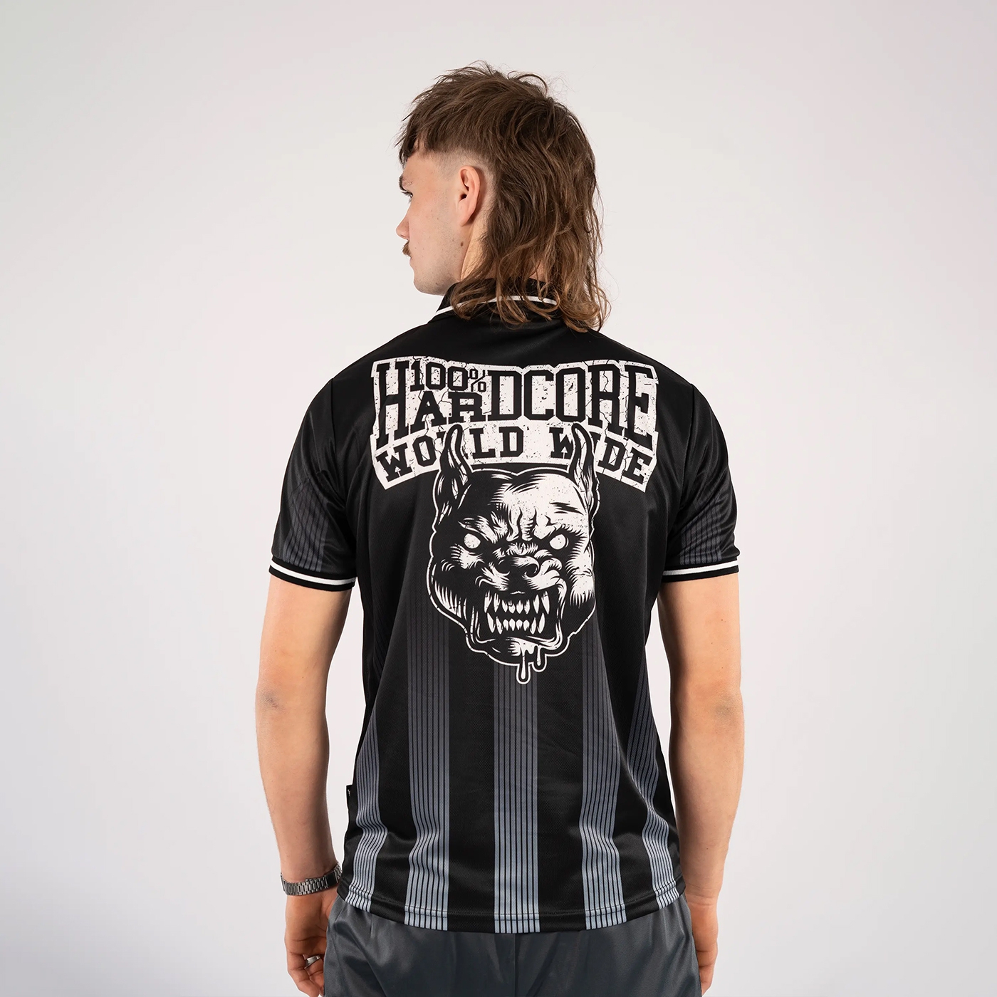 The 100% Hardcore Worldwide football shirt features a large Rage Worldwide print on the back and embroidered logos on the chest. The black color and sleek design give the shirt a simple and recognizable look.