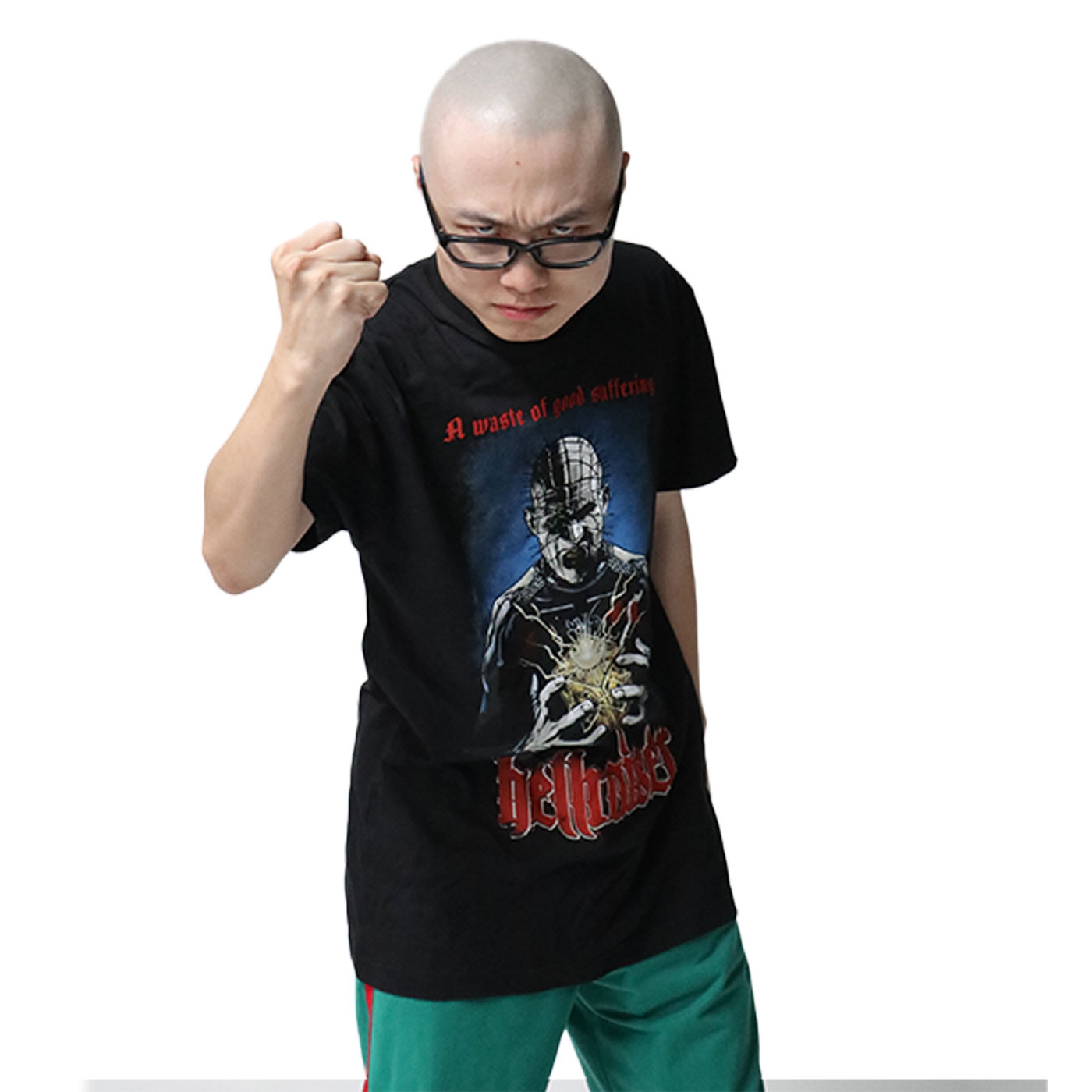 On the front of this shirt is a large full color print of an image of the famous ''Pinhead''.