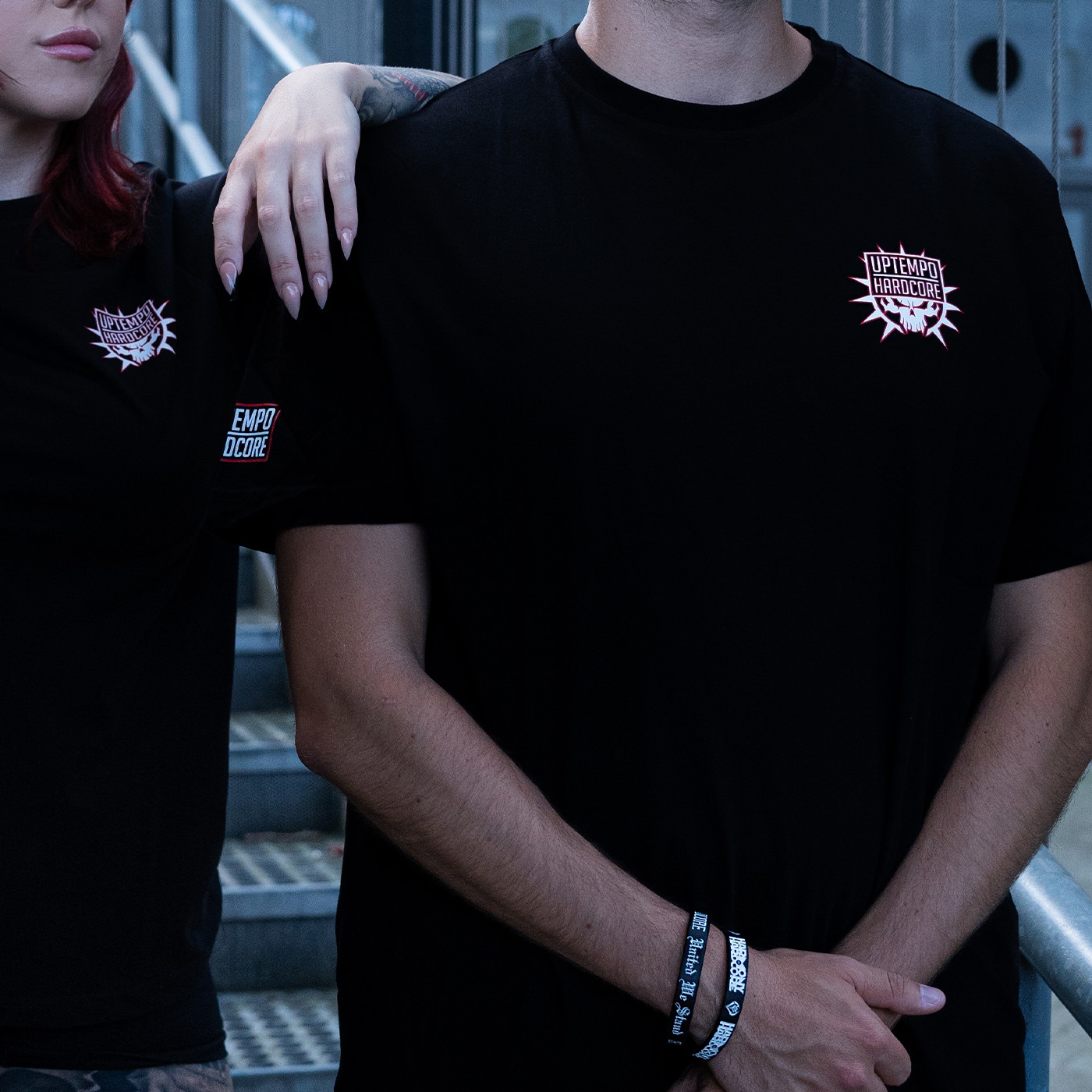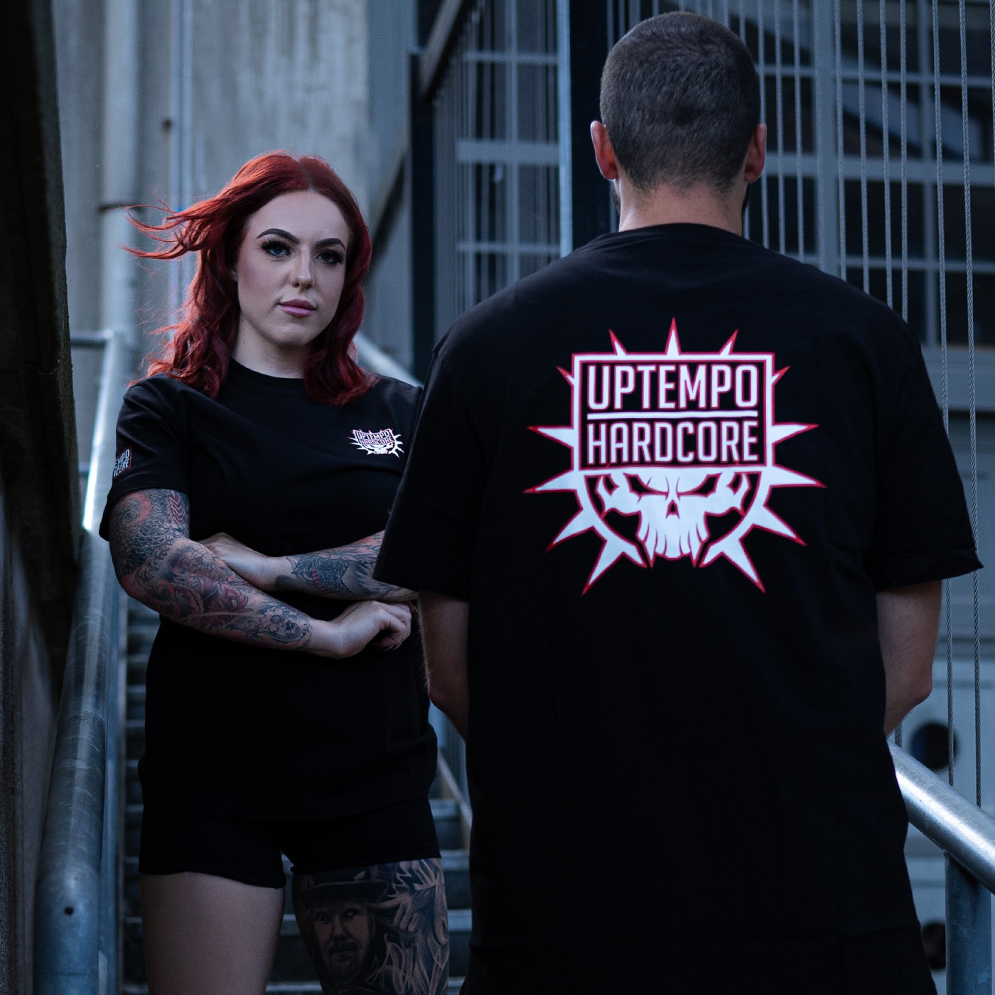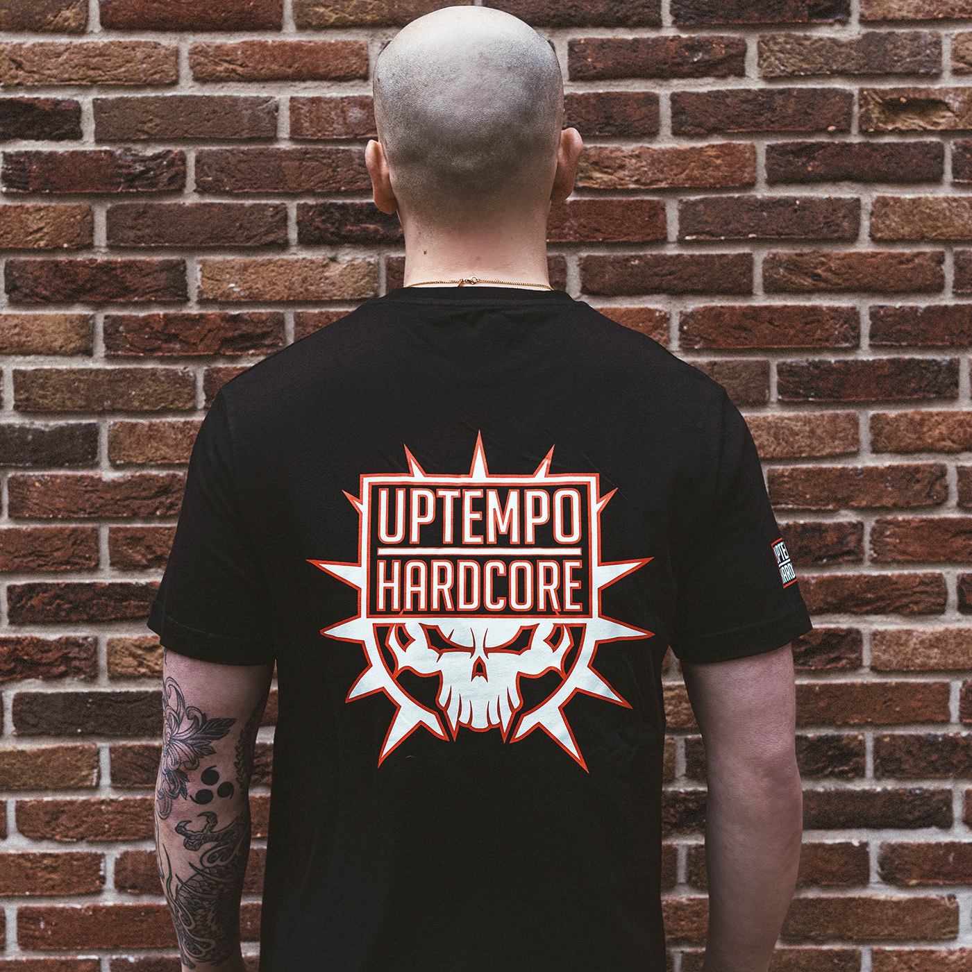 The small logo positioned on the chest and shoulder, large Uptempo Hardcore logo on the back.