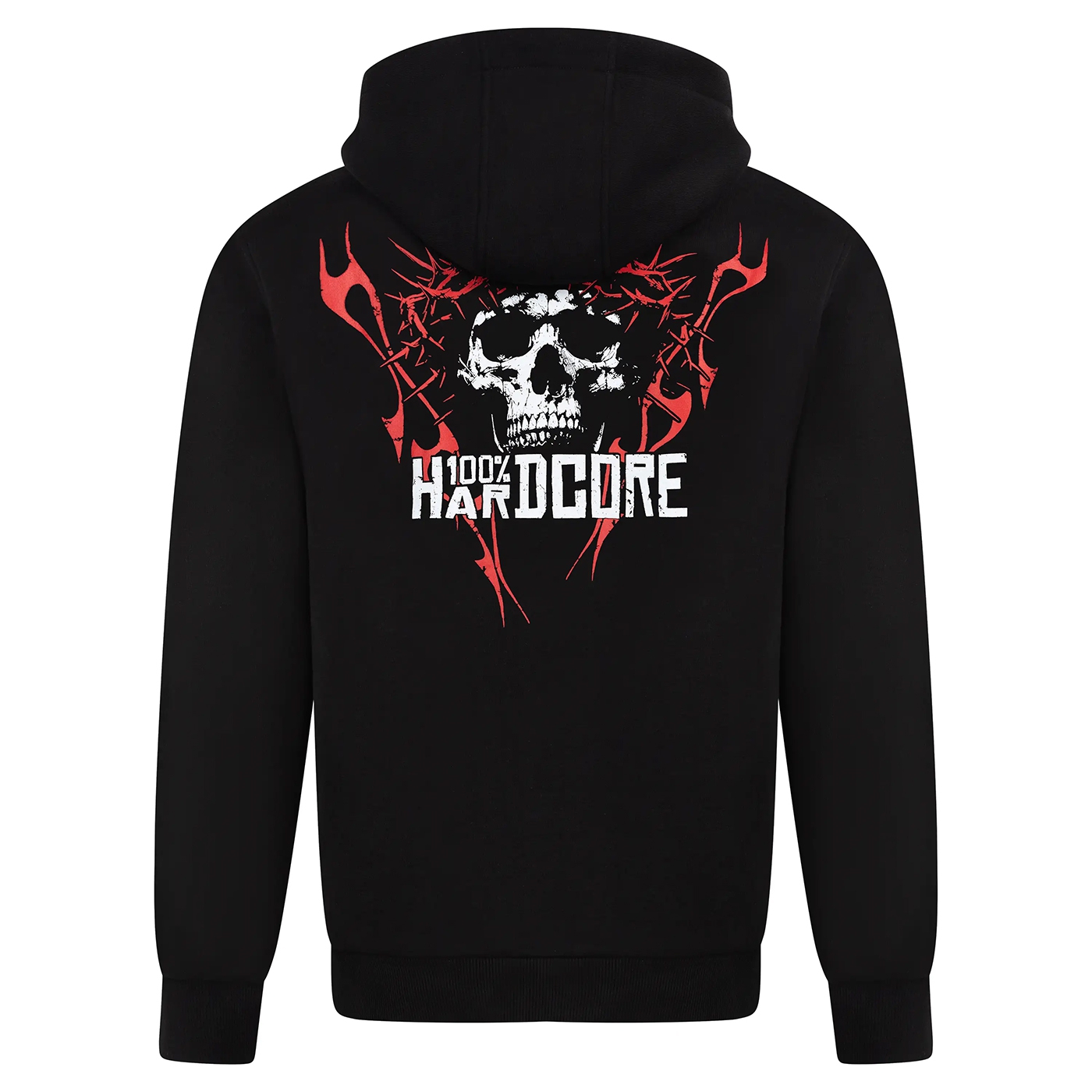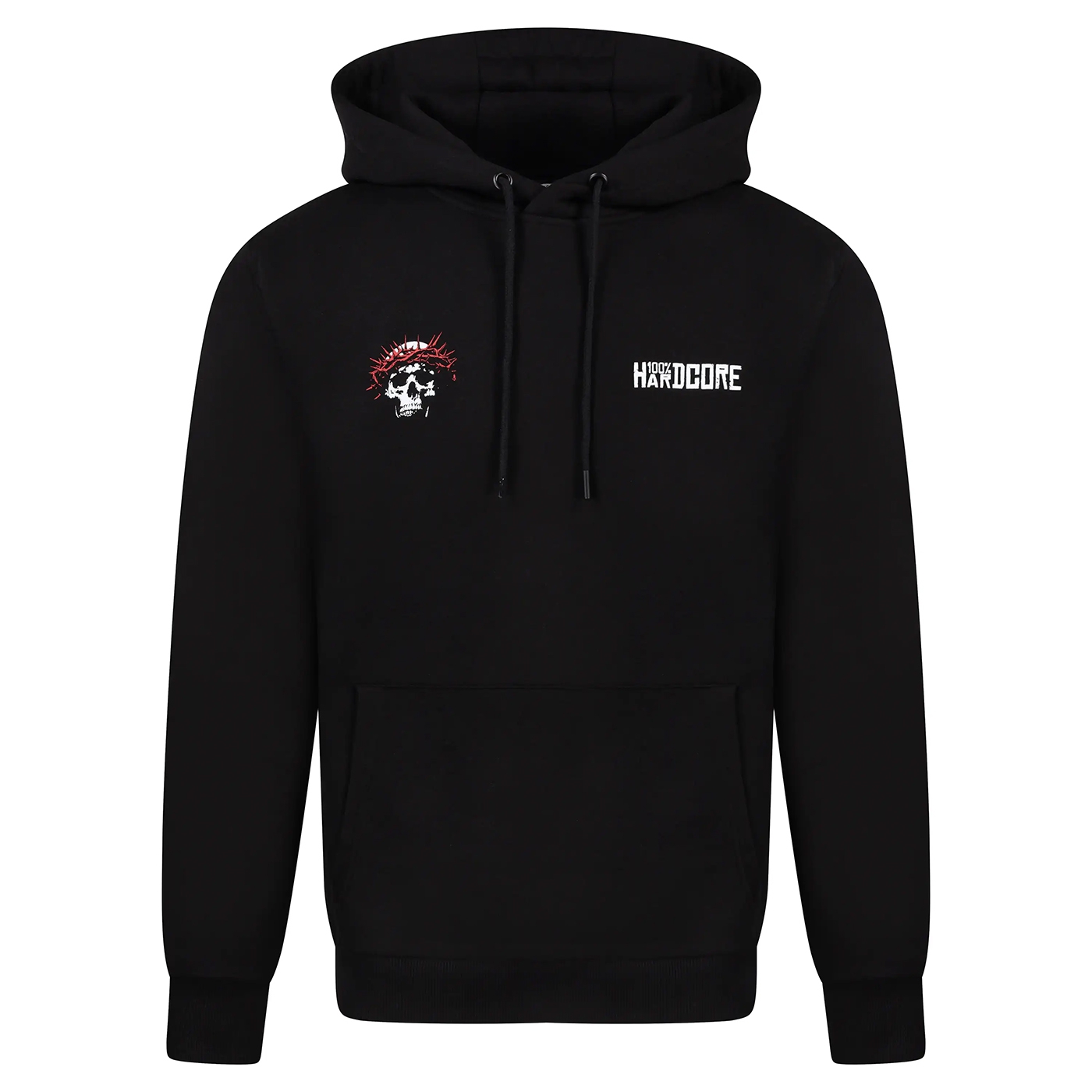100% premium cotton hoodie with a bold red-and-black design. Features a crowned skull graphic on the back and an embroidered 100% Hardcore logo on the chest. Built for comfort and true hardcore attitude