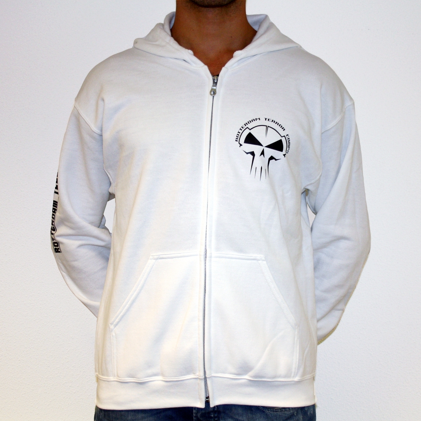 White RTC hooded zipper printed on tyhe front back and sleeve.