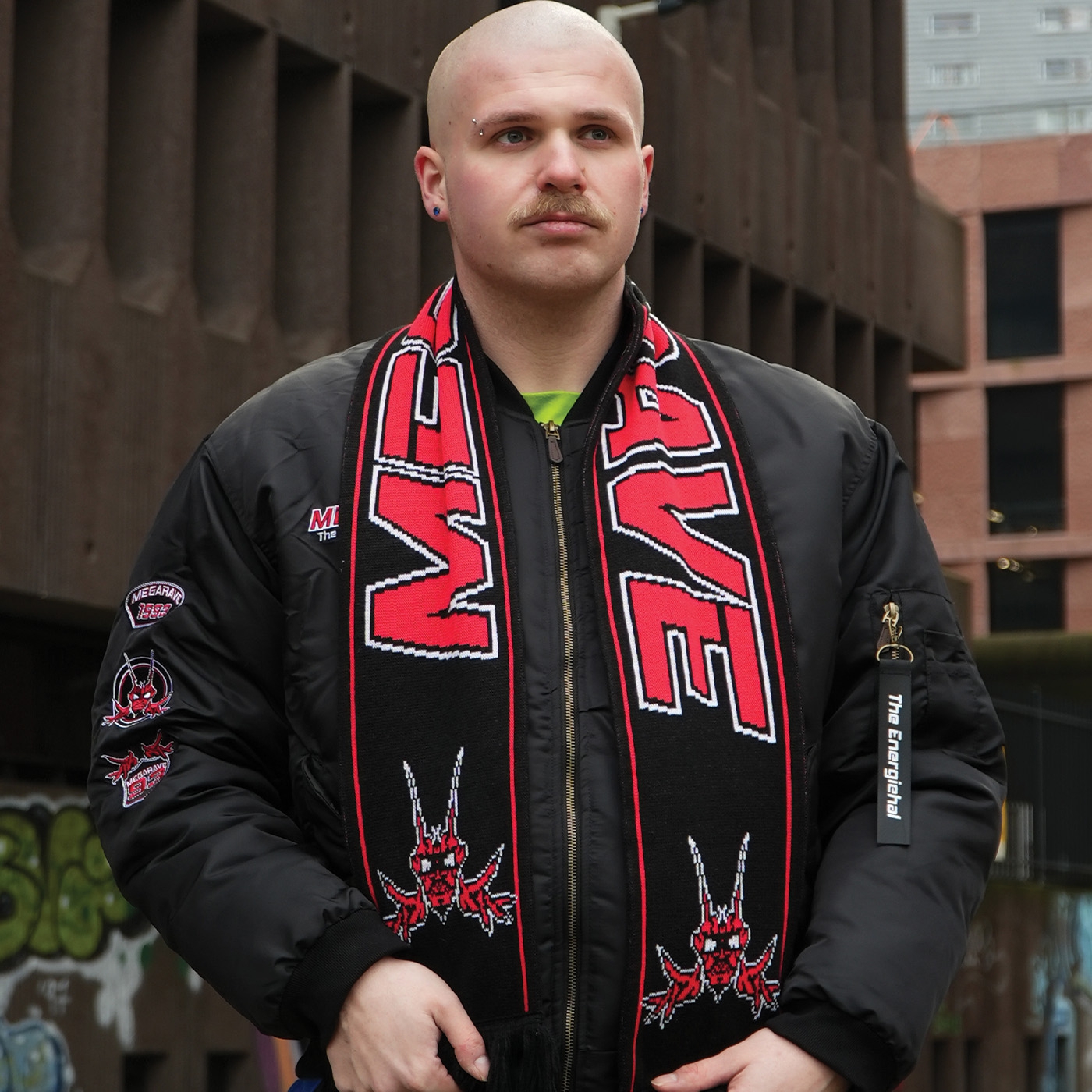 Classic football-style scarf in black and red with MEGARAVE logos on both sides. Double-sided, warm, and ready for the rave. Size 140x17 cm