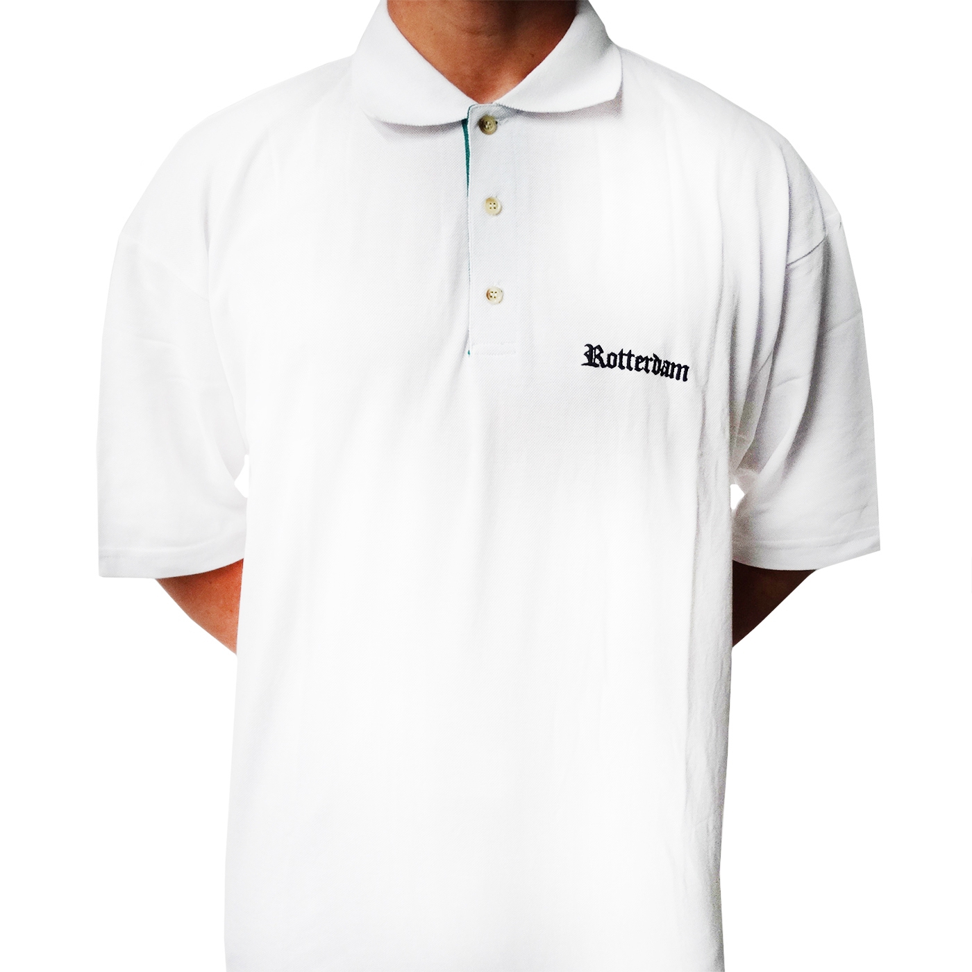 White Rotterdam polosweater. Both sides stitched. Front small, ba...