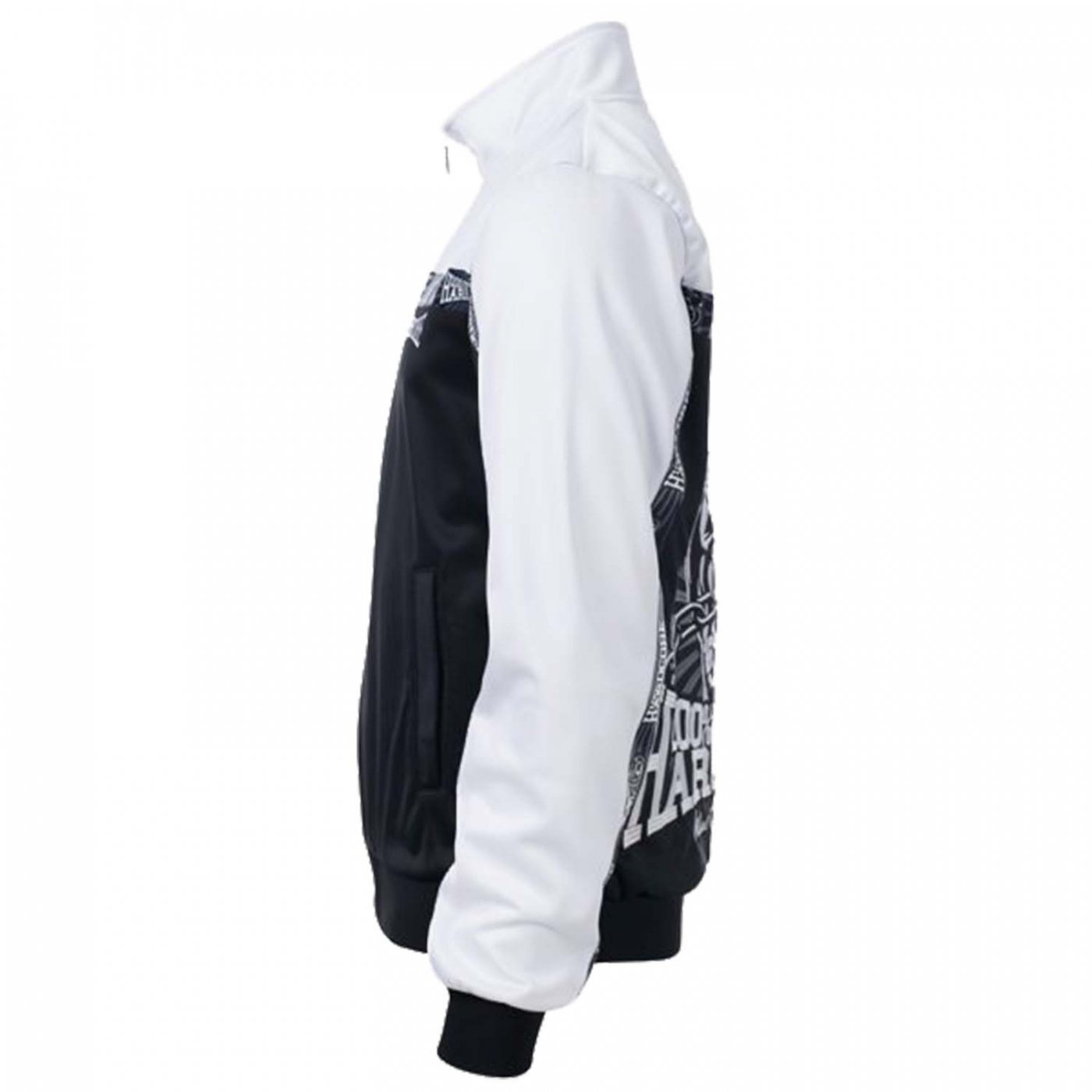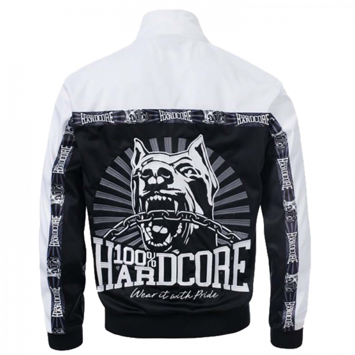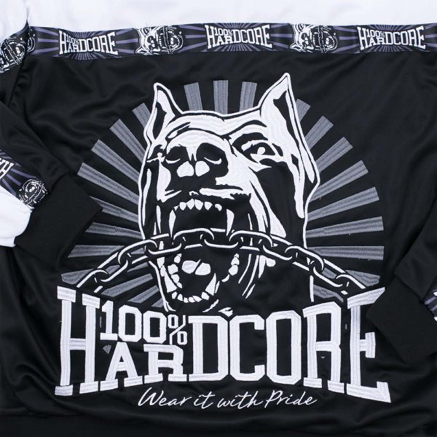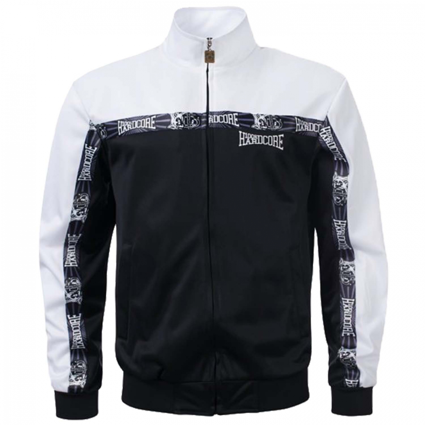 100% Hardcore Trainings jack classic black White. On the back of this jacket is the orignal 100% Hardcore logo in black and white. On the chest all the way down the sleeves is there a 100% Hardcore tape, also on the back of the jacket.
