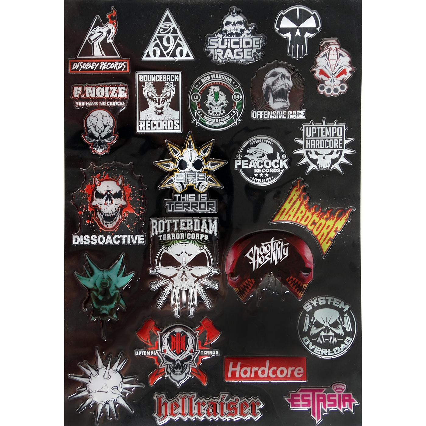 Disobey Records, Triple Six Records, Suicide Rage, RTC, F. Noize, Bounce Back Records, DRS Warrior, Offensive Rage, DRS, Dissoactive, This is terror SRB, Peacock Records, Uptempo Hardcore, Megarave, Rotterdam Terror Corps, Chaotic Hostility, Hardcore Flames, Megarave Records, MBK, Hardcore Supreme, System Overload, Hellraiser, Estasia. All stickers are cut out nicely. A4 = 21 x 30 cm.