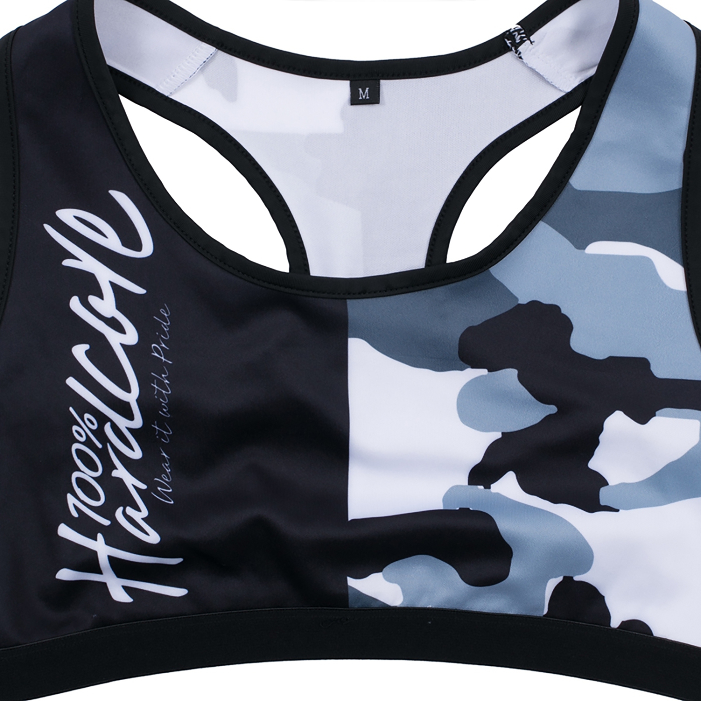 One half is black with the 100% Hardcore logo and the other half is gray / white camouflage print