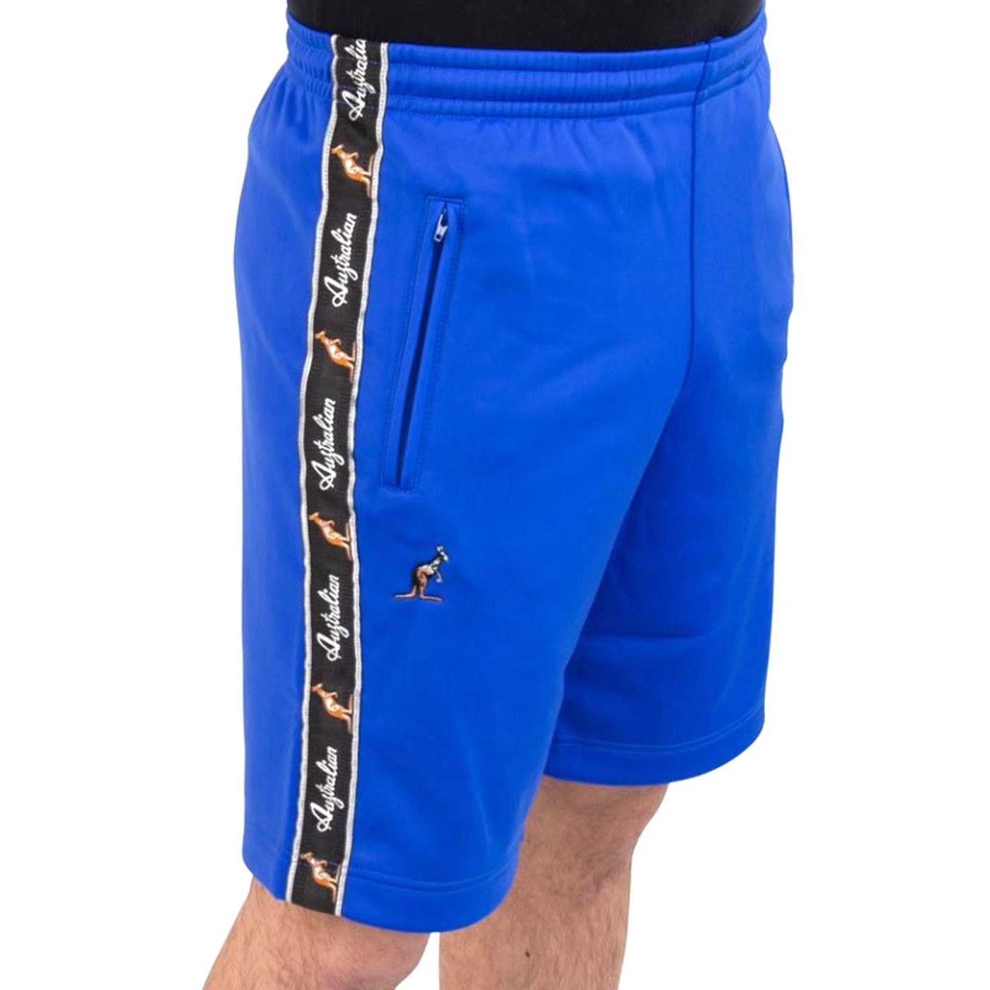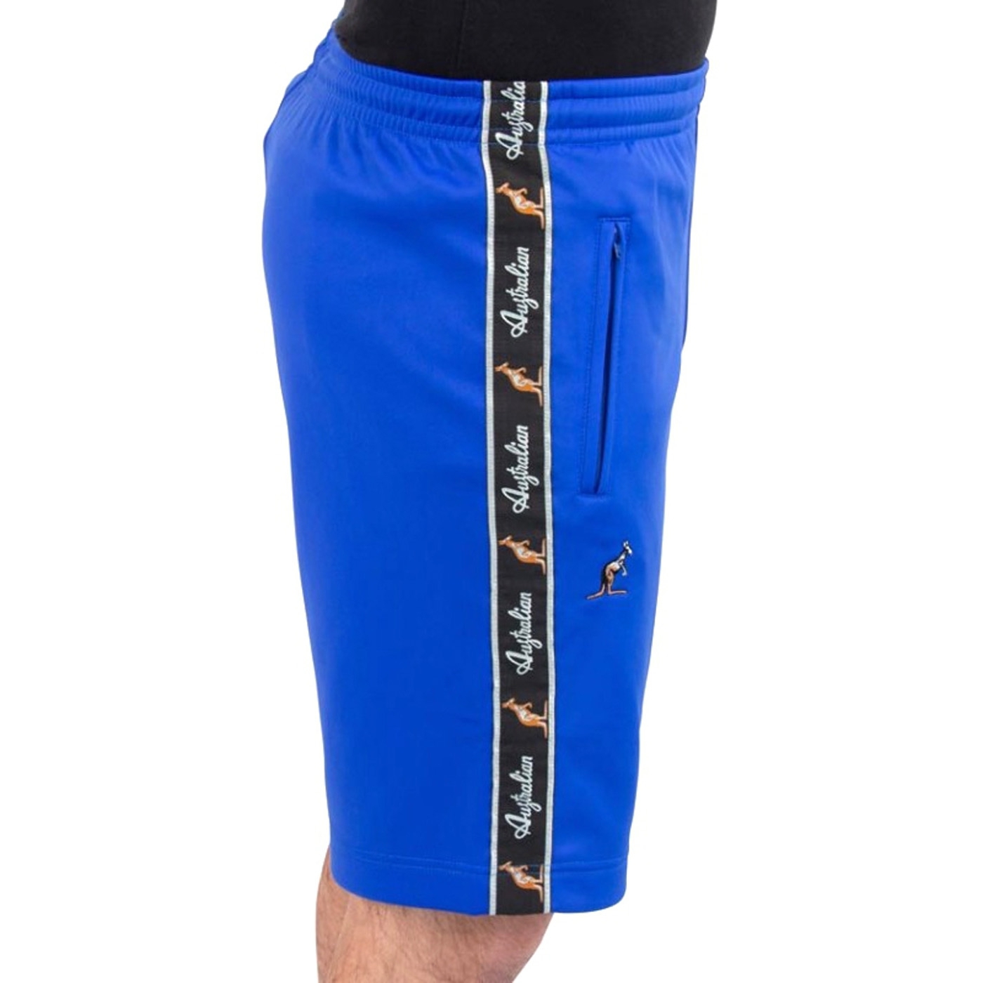 High quality shorts from Australian. The pants are blue with a black trim. The pants have two pockets, one with a zipper. The Australian logo is embroidered in small size under the right pocket.