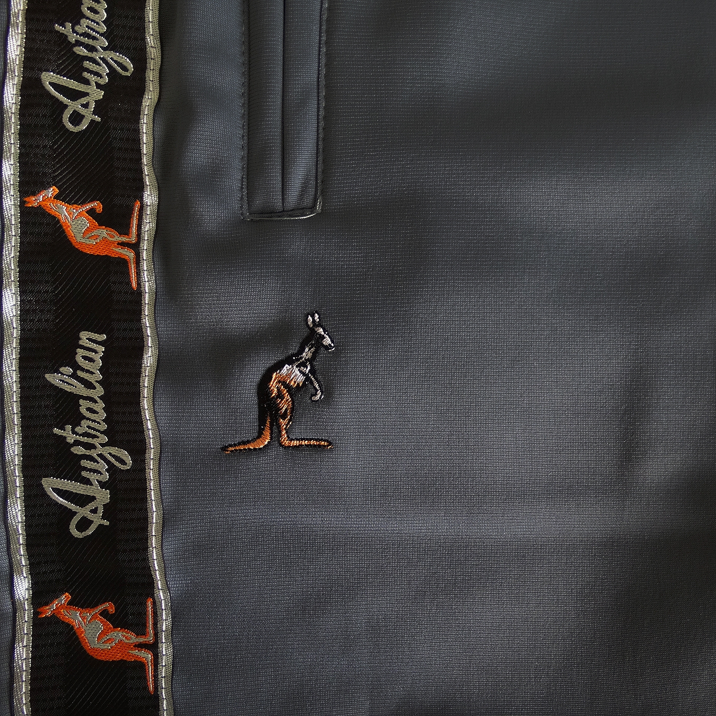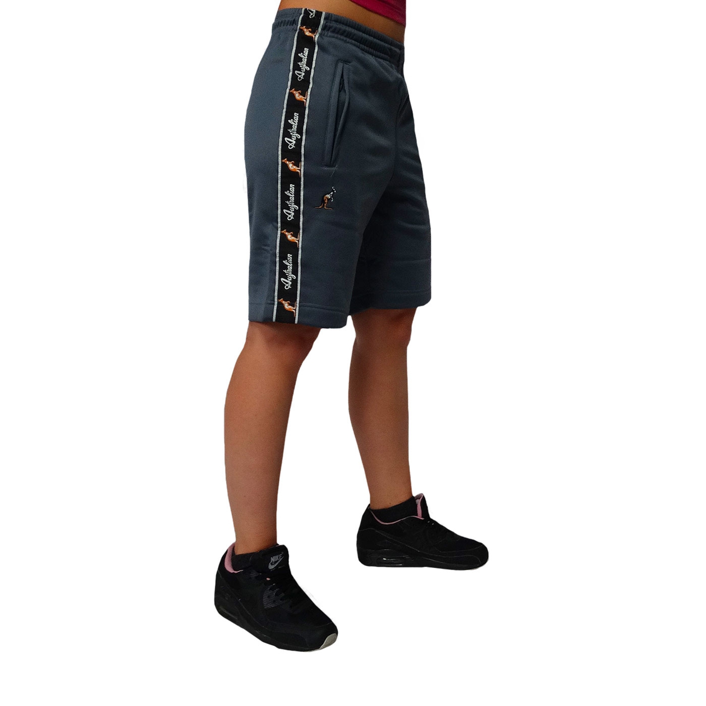 High quality shorts from Australian. The pants are gray with a black trim. The pants have two pockets, one with a zipper. The Australian logo is embroidered in small size under the right pocket.