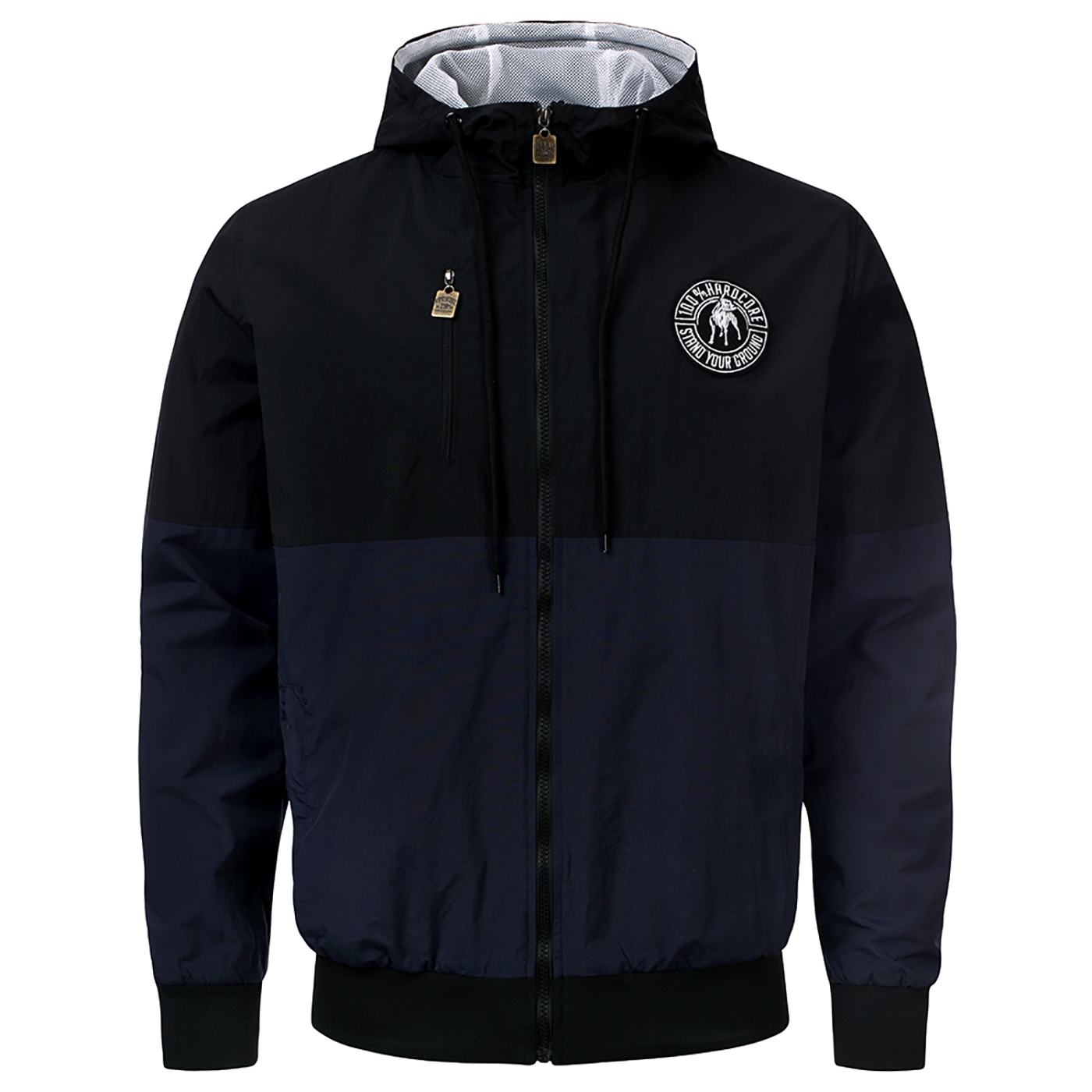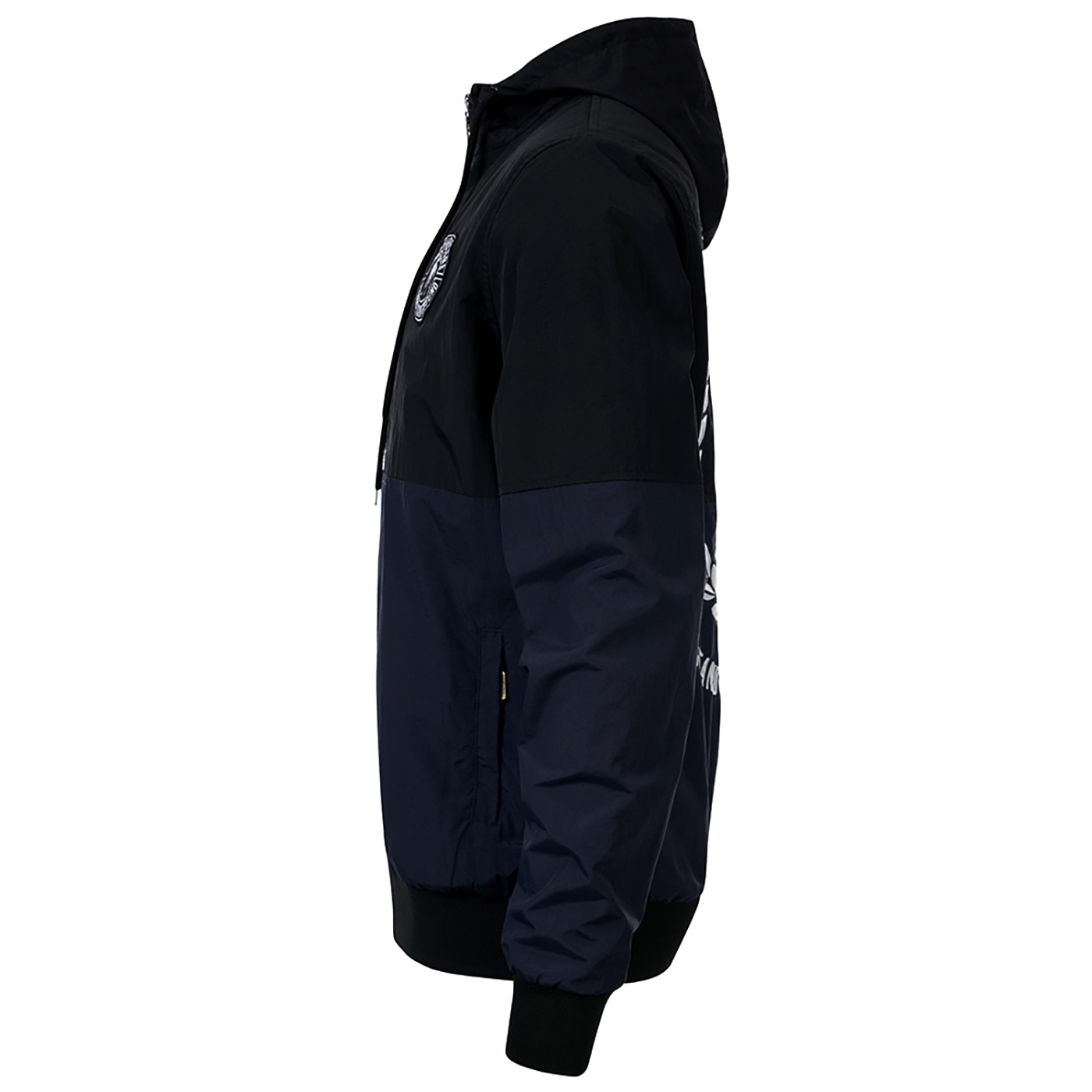 Blue & Navy colored windbreaker made by 100% Hardcore. The print on the back is embroidered. There are two zip pockets at the front. There is a patch on the left chest. On the right chest is an extra pocket with zipper.