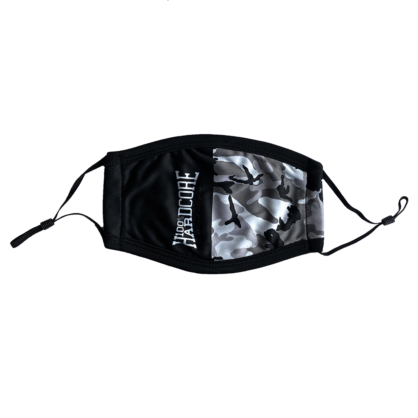 Mondkapje met aan de ene kant een zwarte opdruk met het 100% Hardcore merklogo en aan de andere kant een camouflage print.
