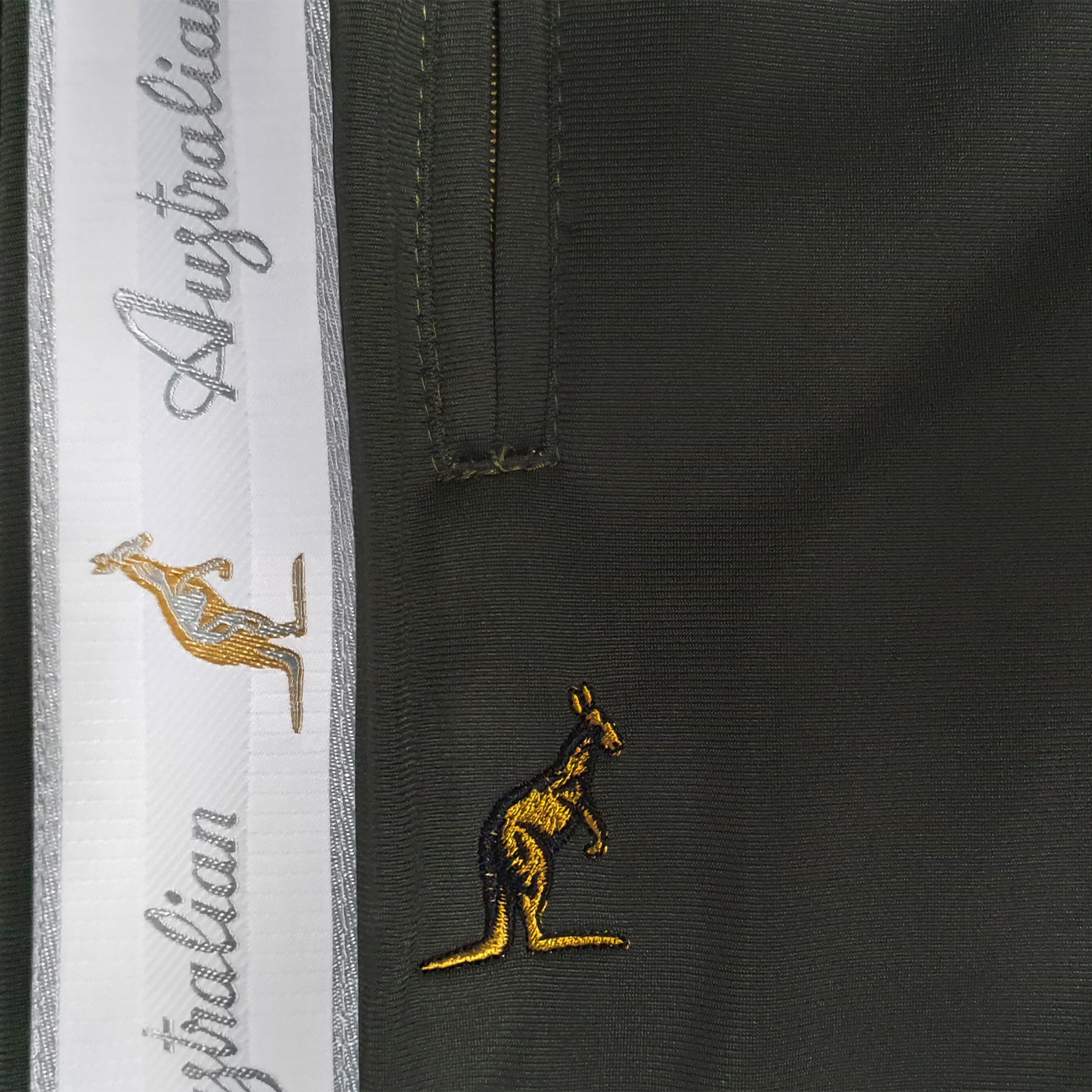 Australian olive green pants with a white ''tape".