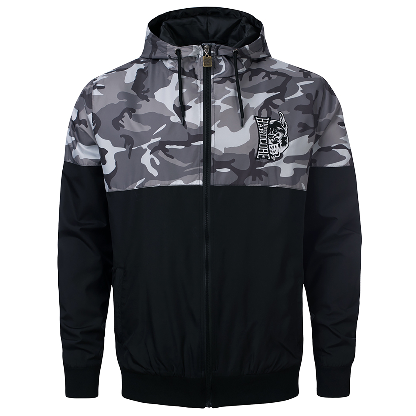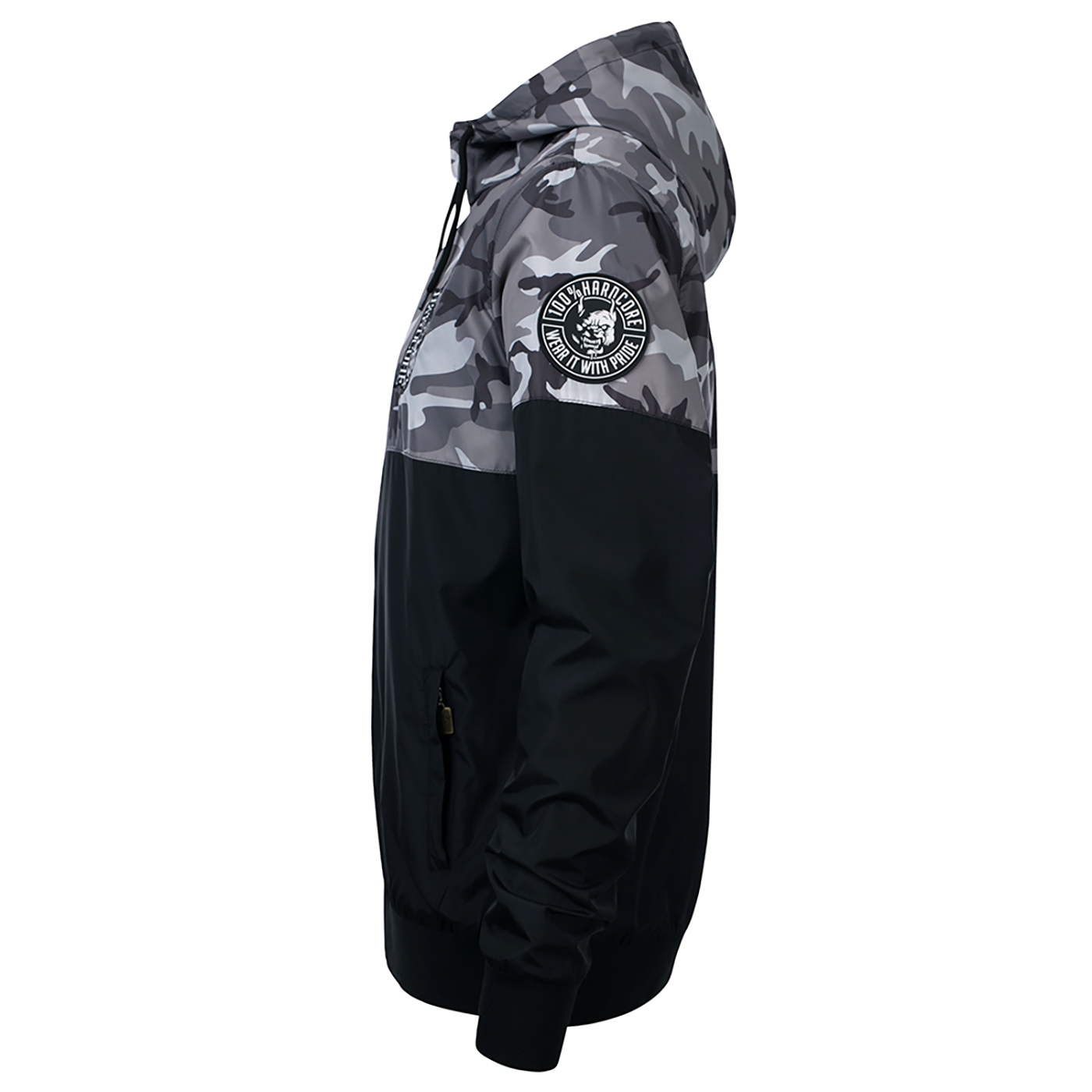 Black and camouflage windbreker. Embroided badge on front. 100% Hardcore printed on the back. Badge on arm.