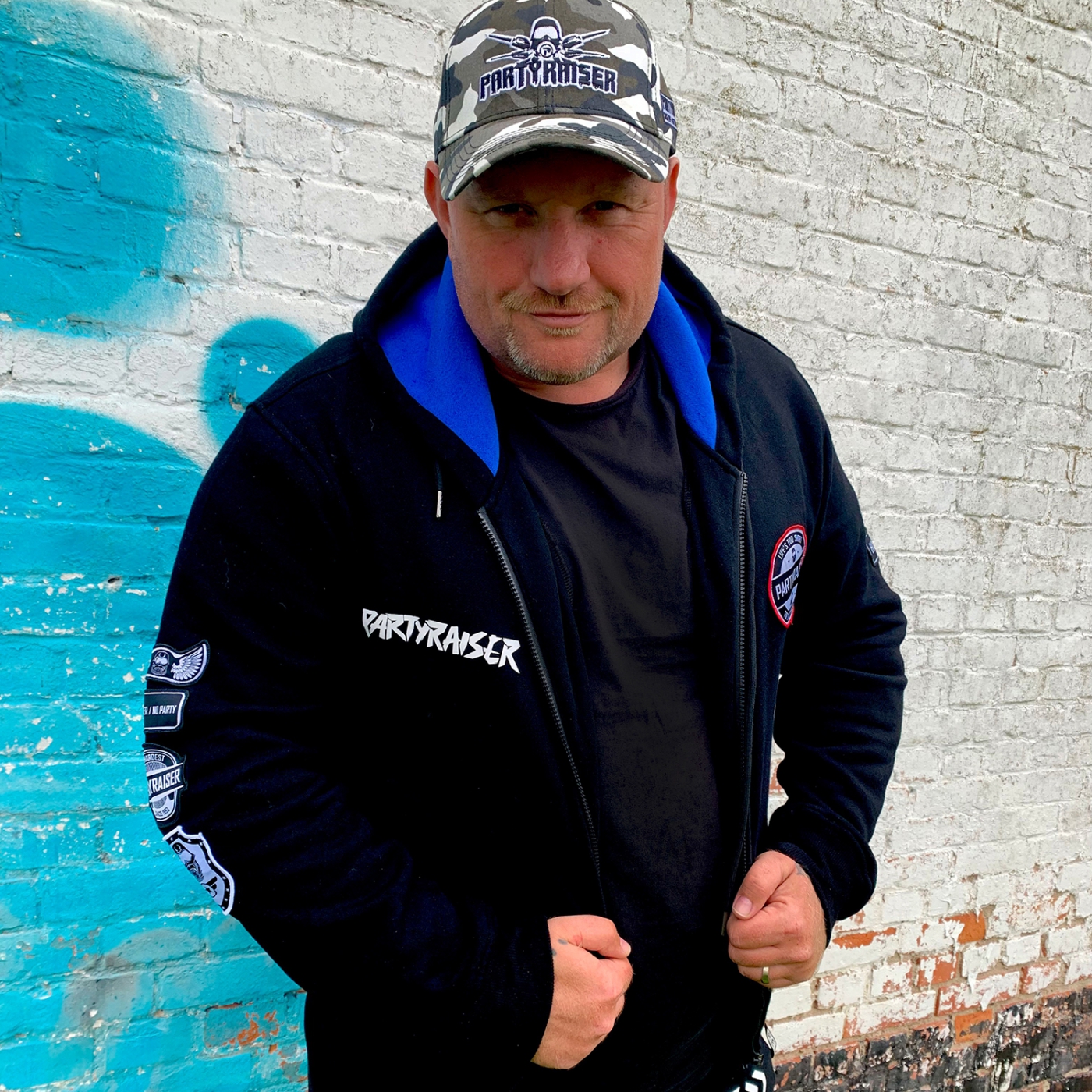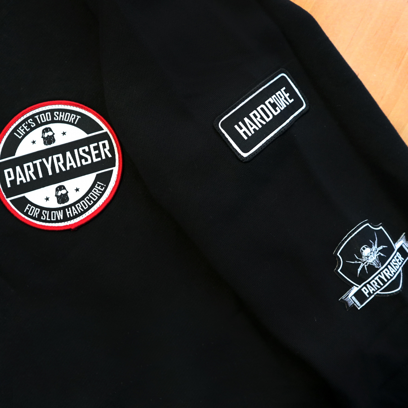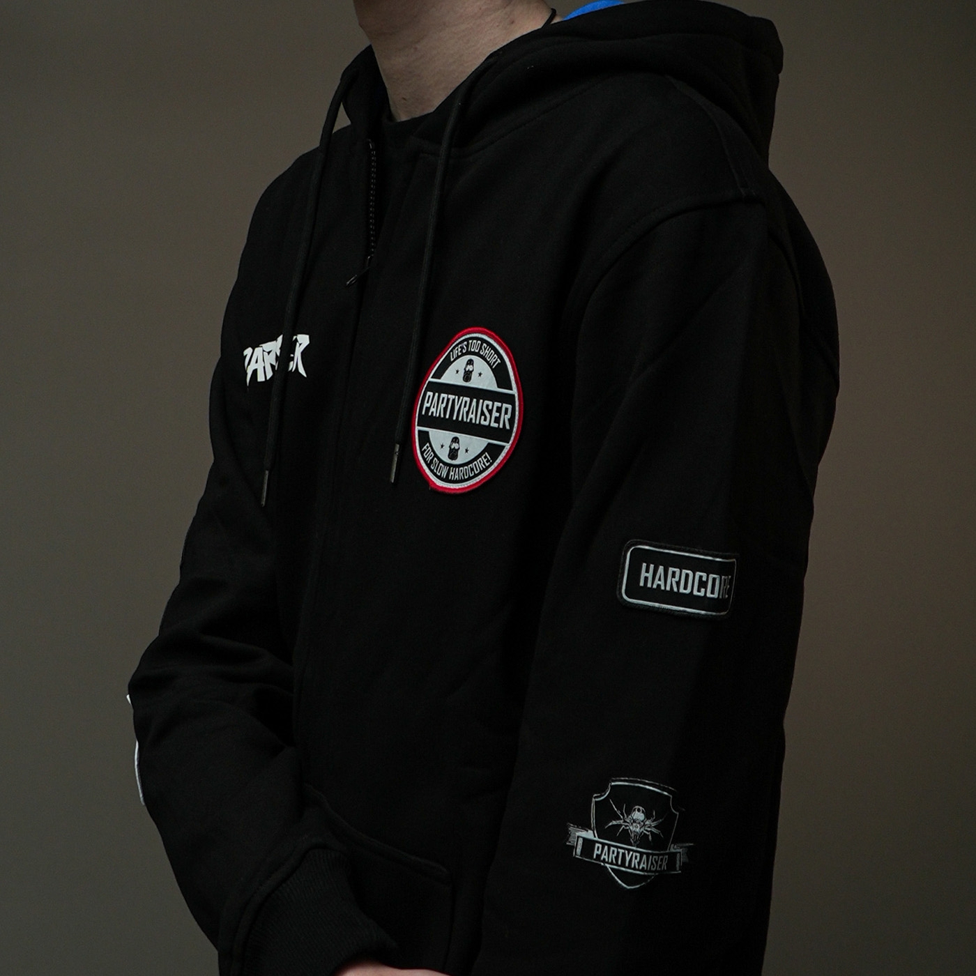 This Black Partyraiser hooded is with a red, black & white logo on the front, with exclusive patches on the sleeve and the Partyraiser logo embroided on the back, with blue customized inside. It comes with a customized Partyraiser plastic bag.