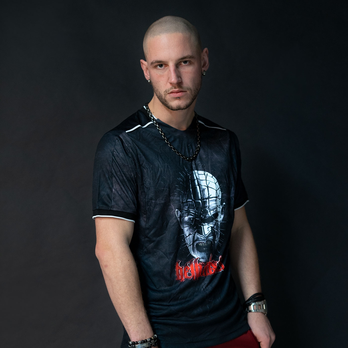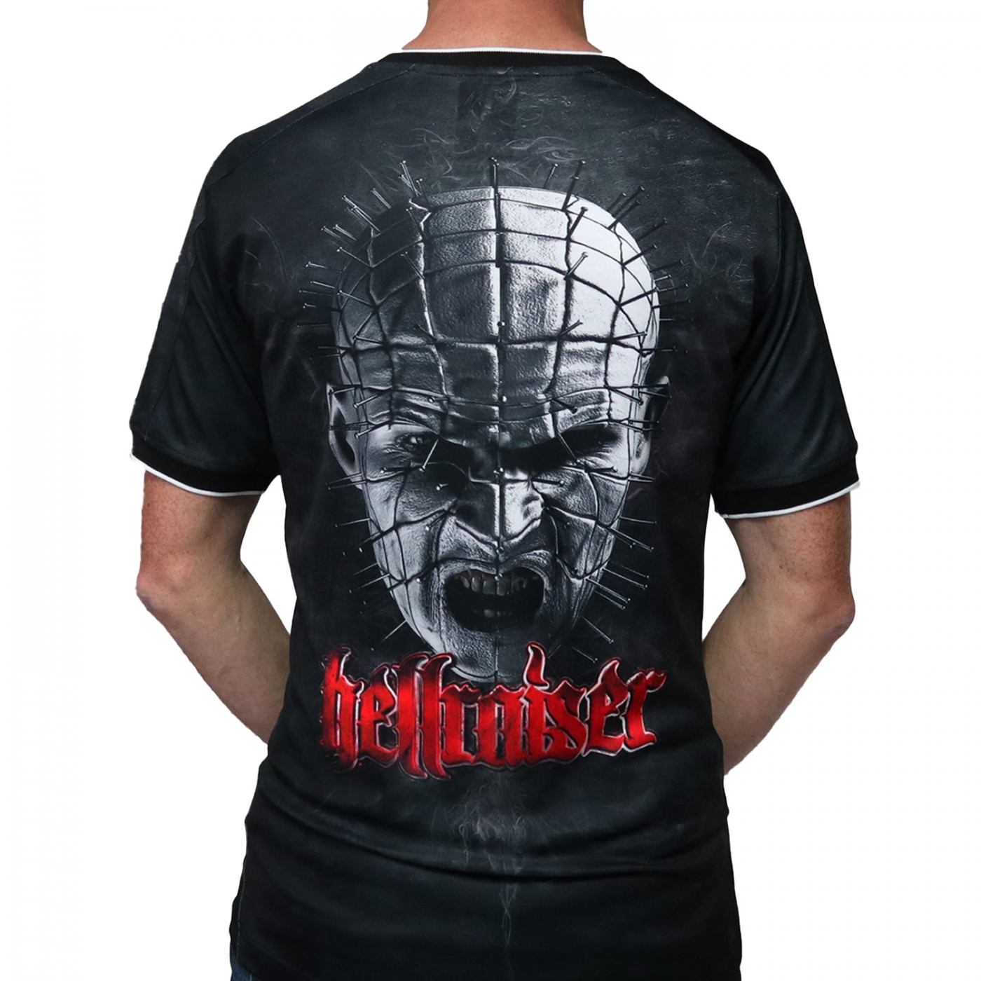 This shirt has a full color print of the famous ''Pinhead'' on the front and back.