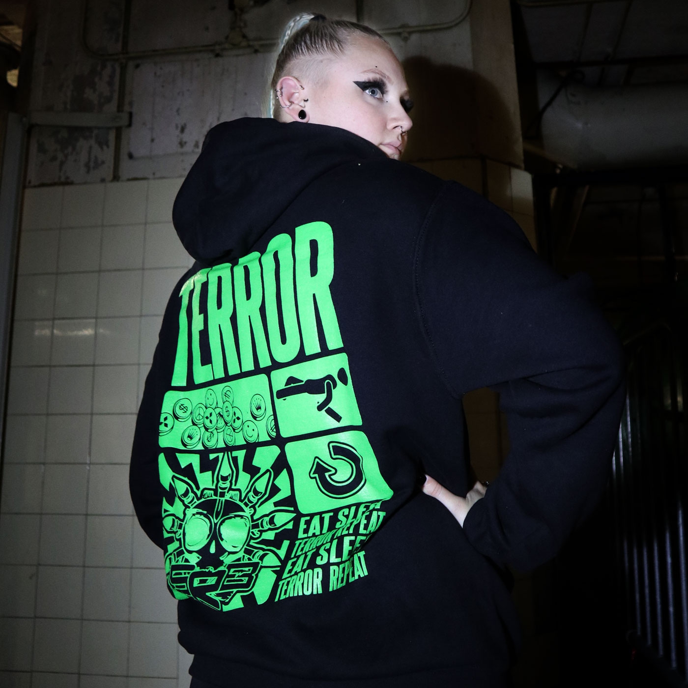 Black SRB hoodie. Green print on the front, on the back SRB, Terror and ''Eat Sleep Terror Repeat''