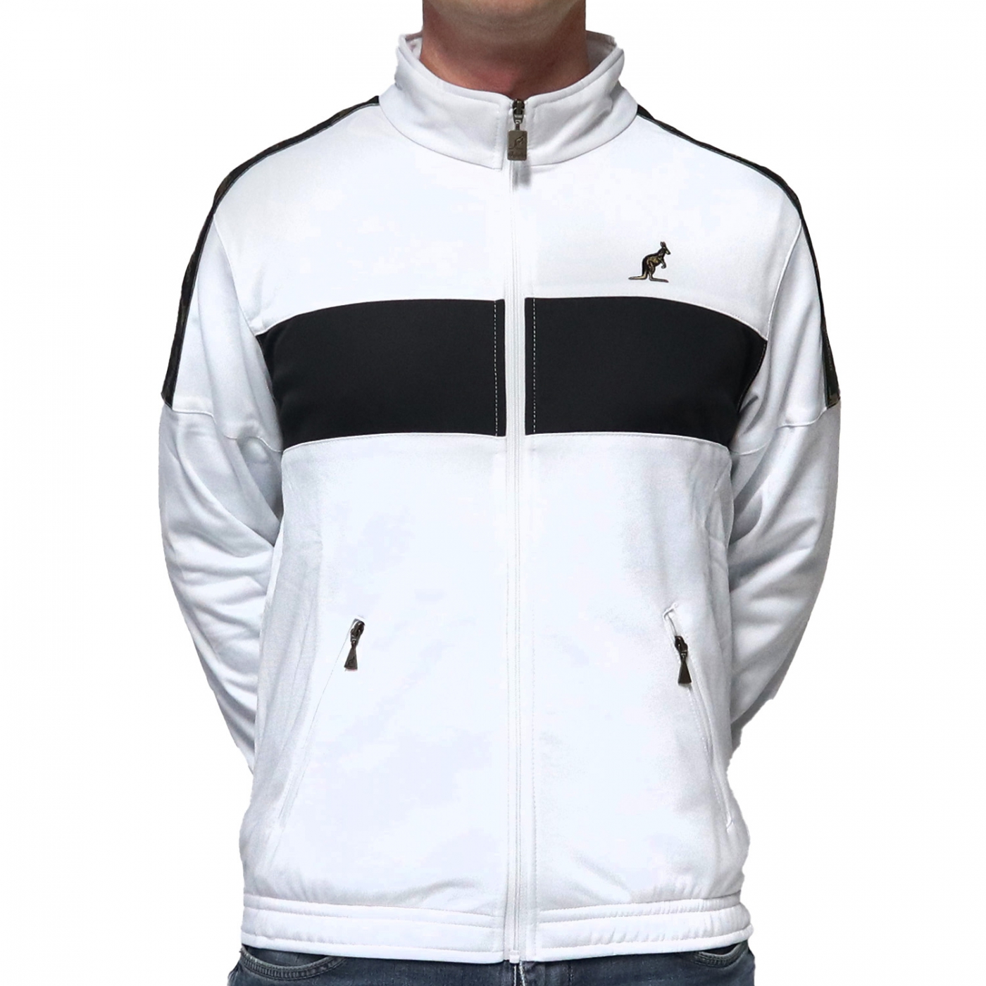 This white cardigan is of high quality and has a black colored block on front + black band / tape on the shoulders. It has the Australian logo on the front