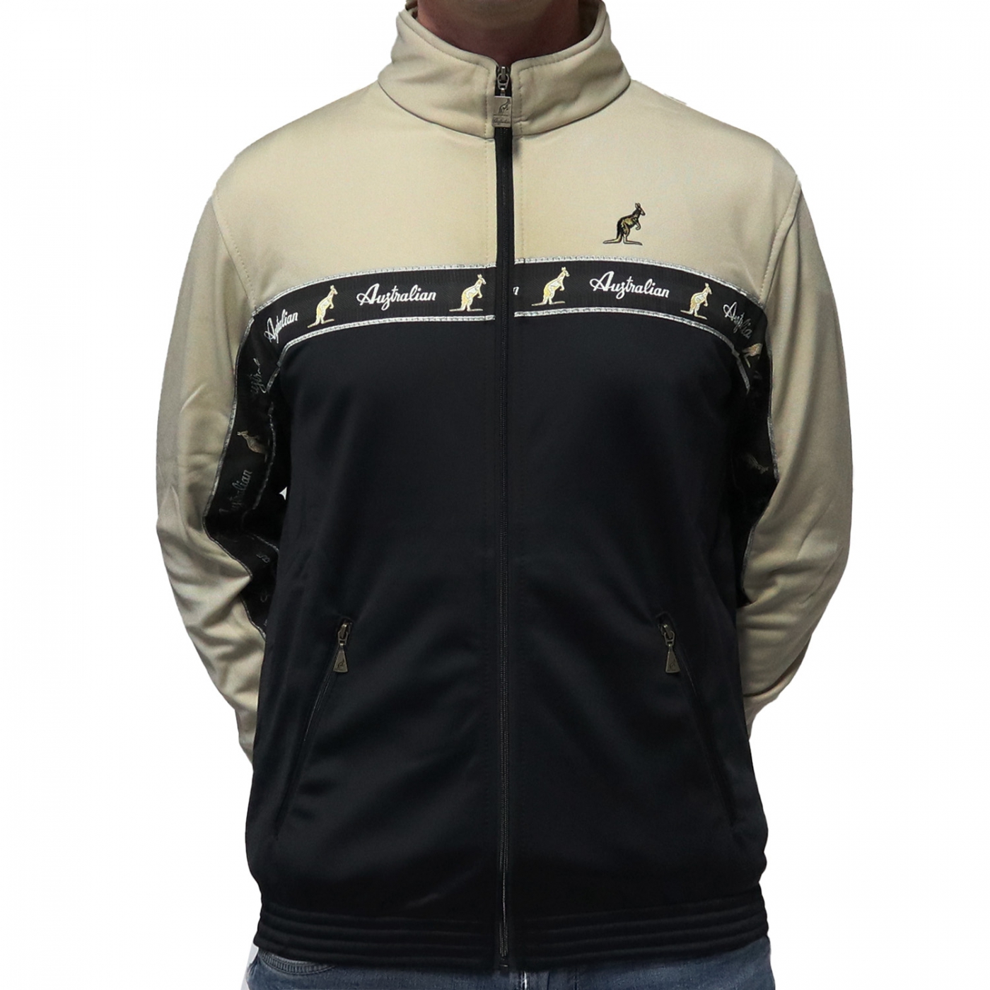 This jacket is of high quality and is black / sand colored with a black band / tape. It has the Australian logo on the front