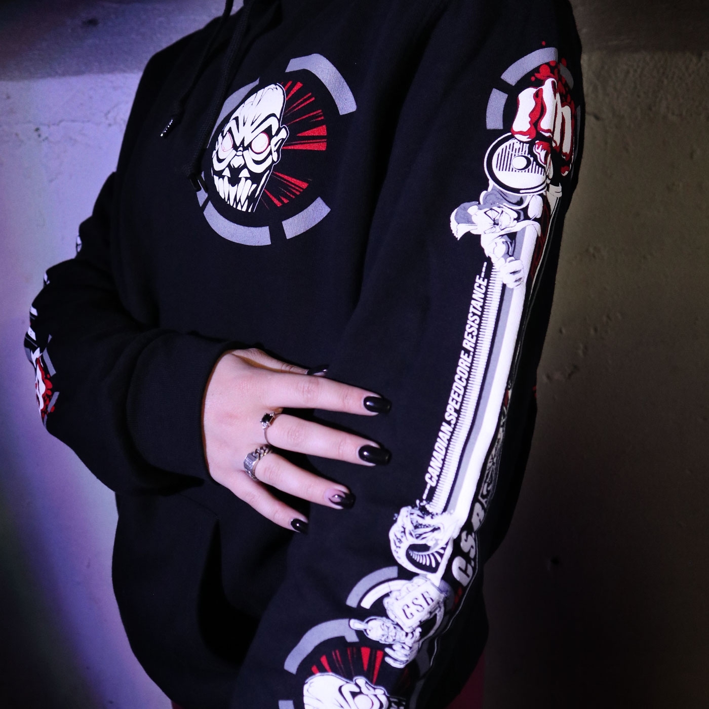Black CSR Terror hooded. Printed in white and red on front, back and both arms.