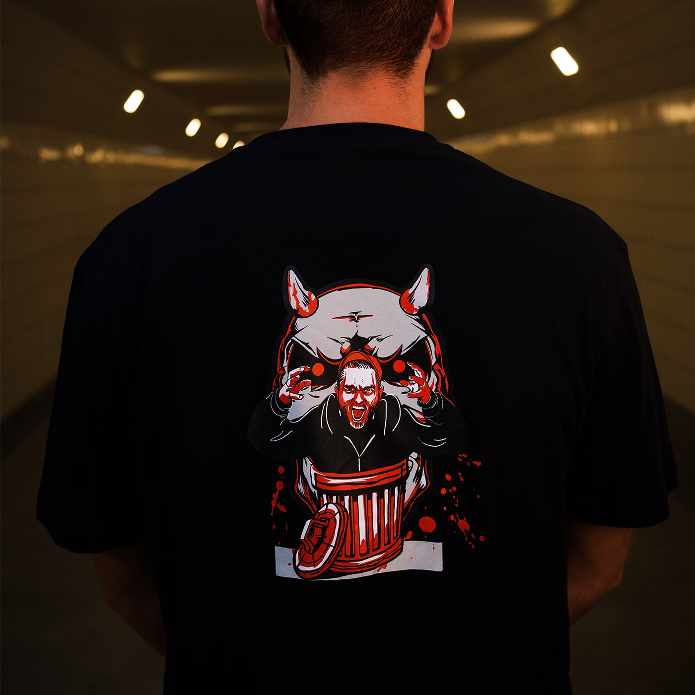 T-shirt showcases a bold and unique design with a big print on both the front and back. The artwork depicts Dissoactive, sitting inside a trash can alongside horses. This is a captivating composition inspired by the latest Dissoactive EP with a touch of irony.