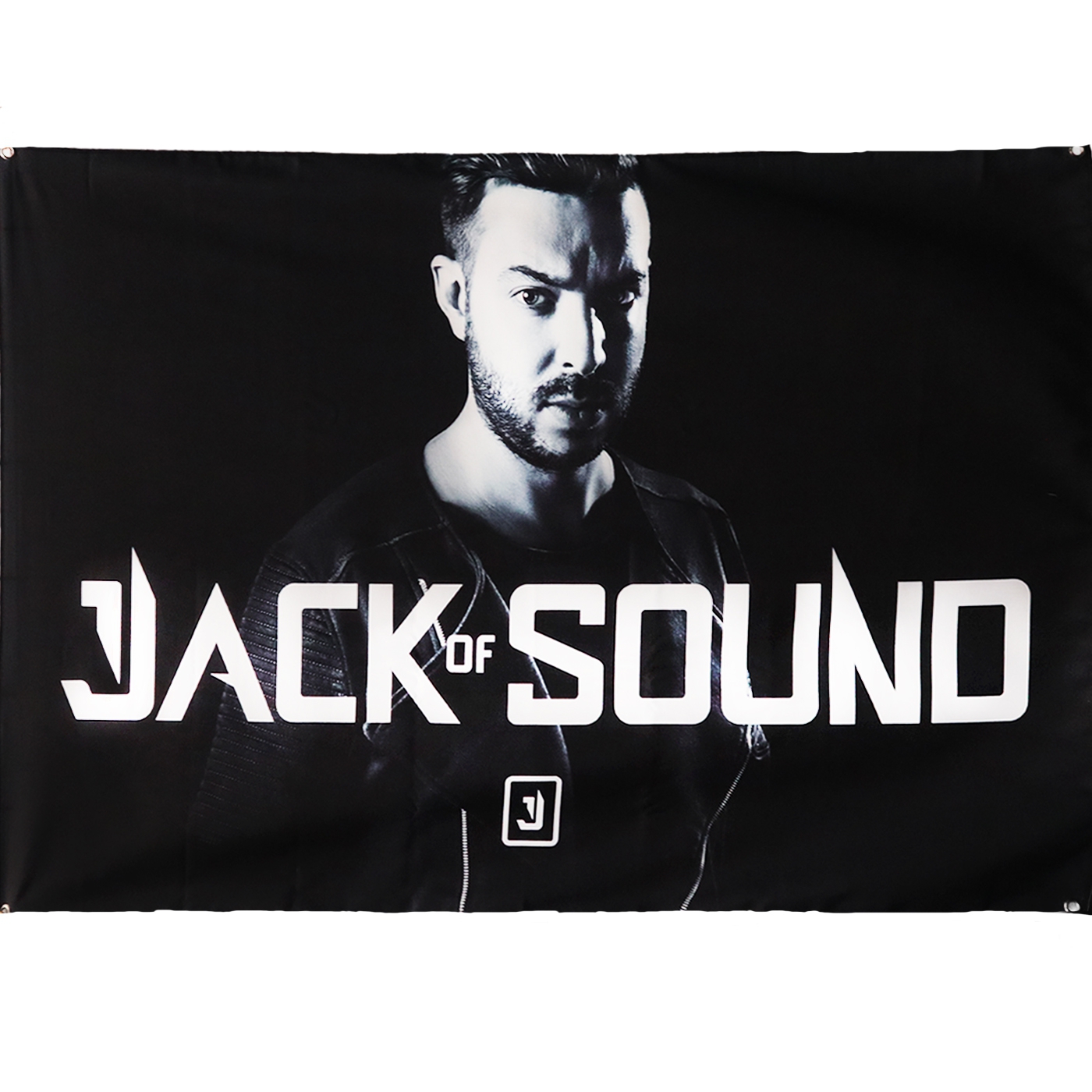 Black flag with a print of a photo of Jack Of Sound.