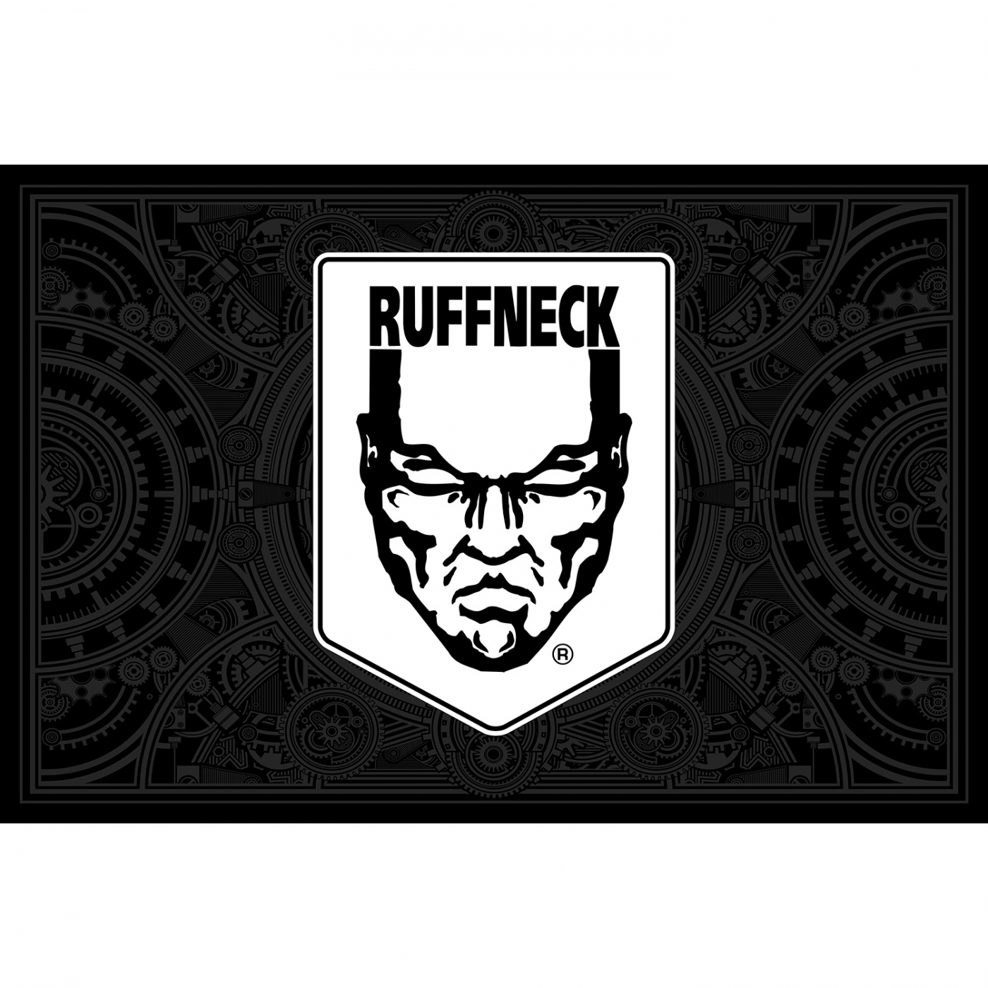 Flagge mit Steampunk-Hintergrund, mit dem Ruffneck-Logo in der Mitte.